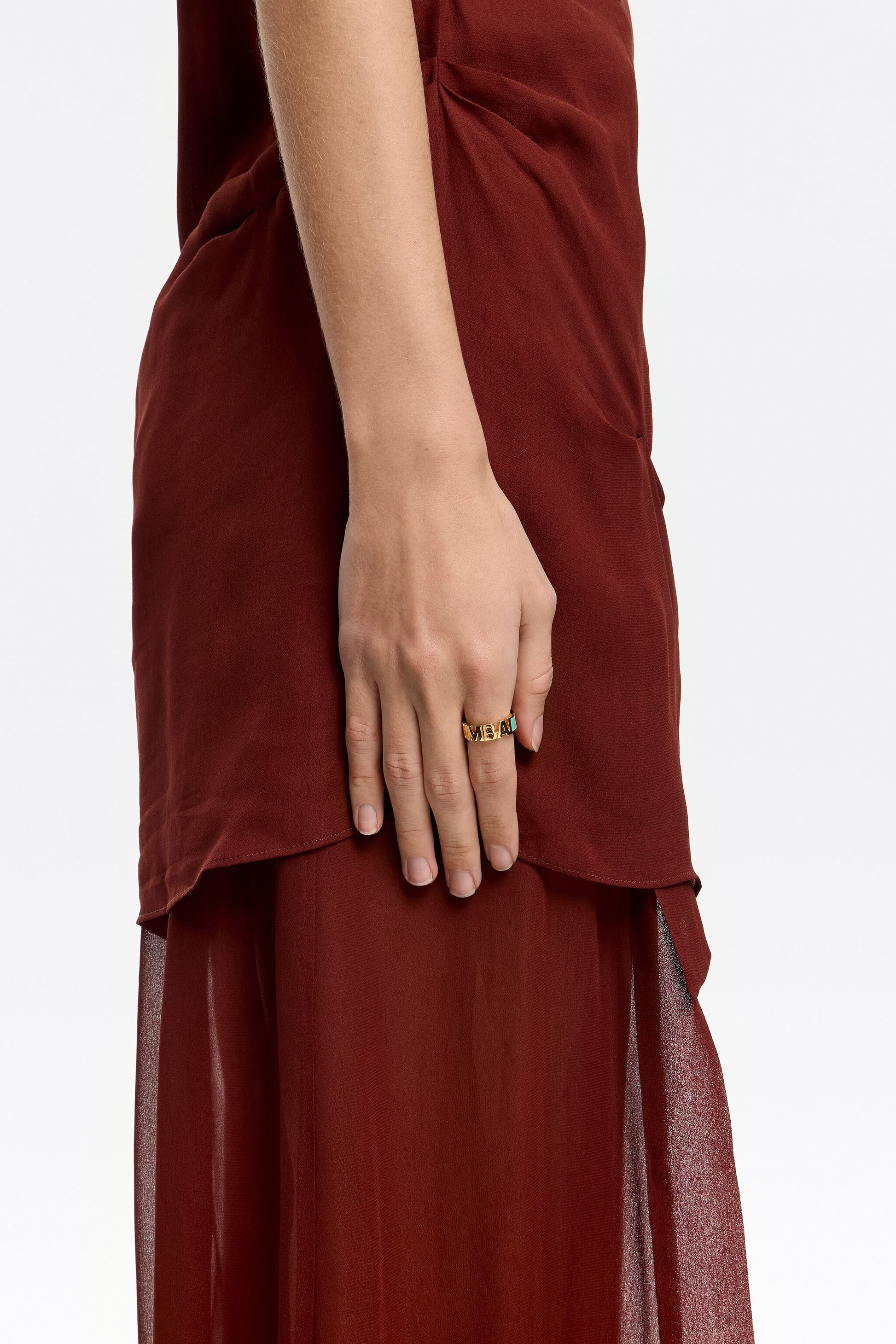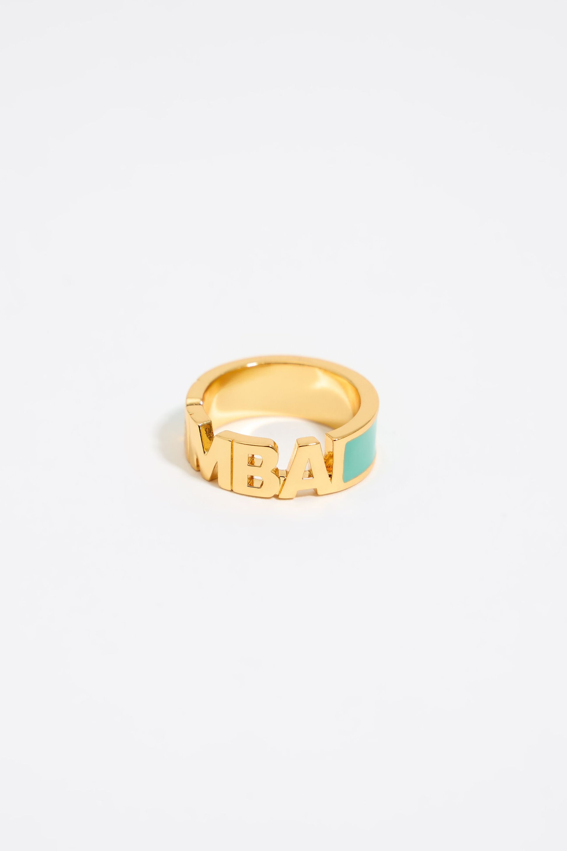 Gold ring with aquamarine enamel and gold logo. Model customized with engraved logo.