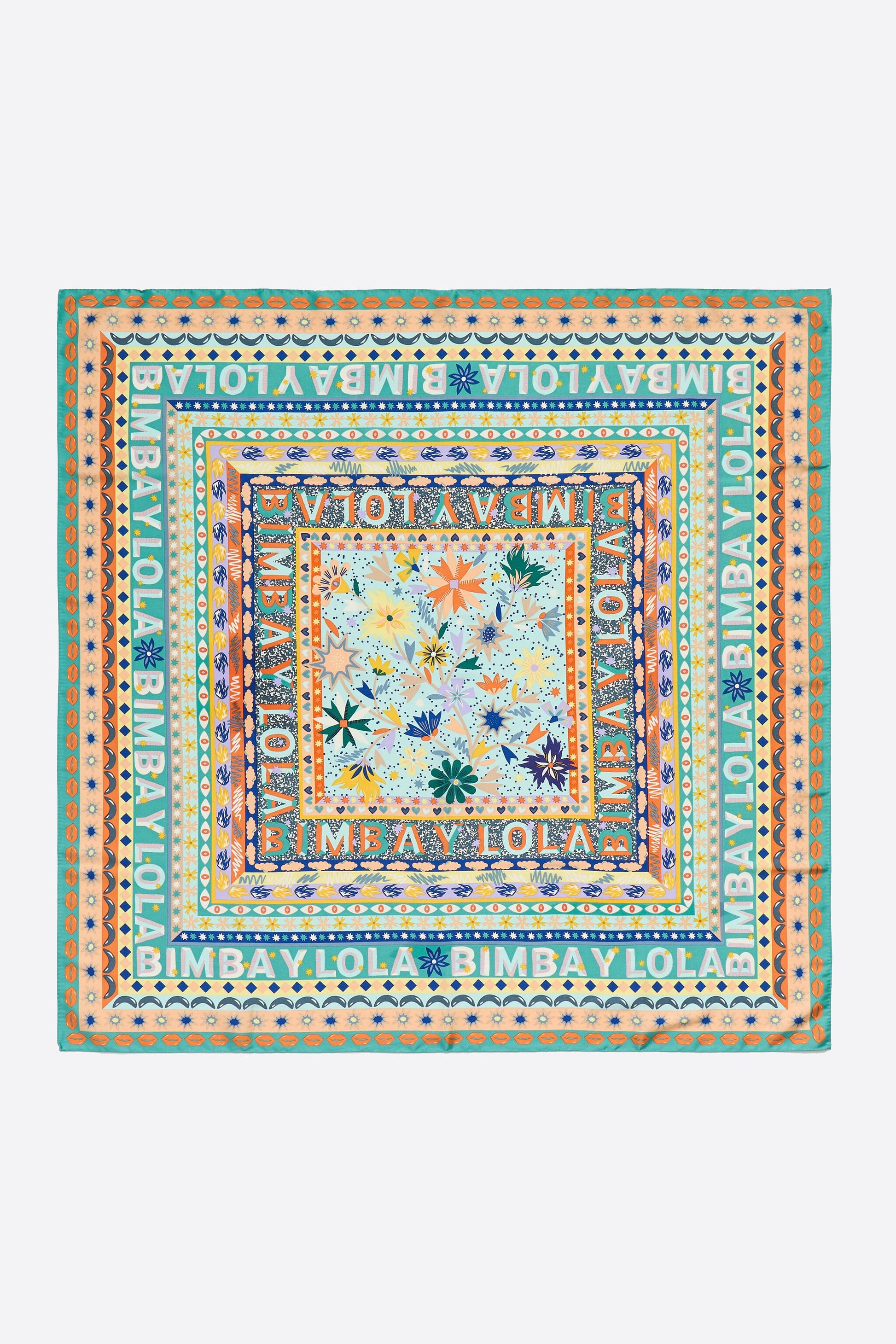 Scarf with borders and floral and logo prints on an aquamarine background. 100% Recycled polyester.
