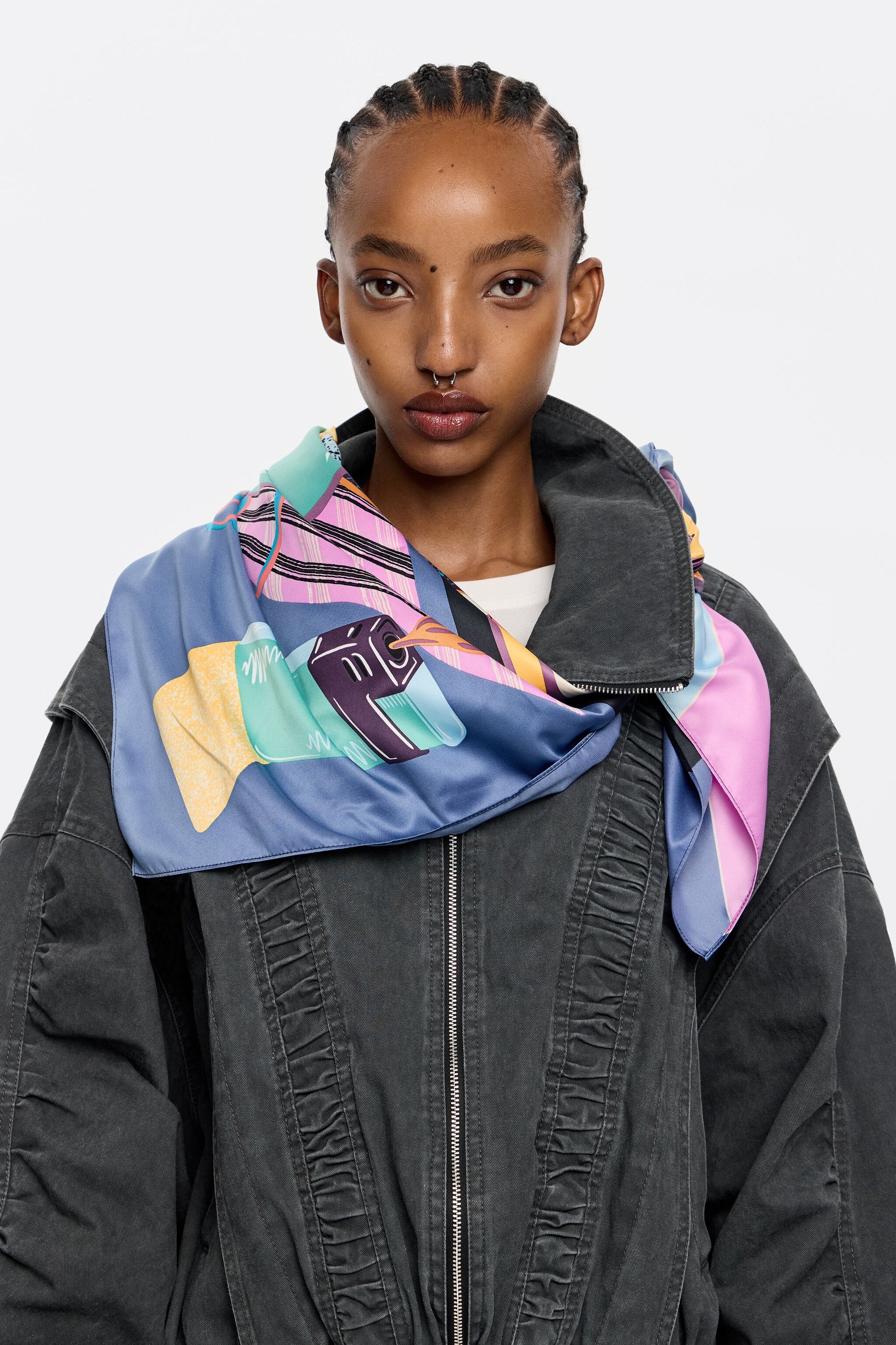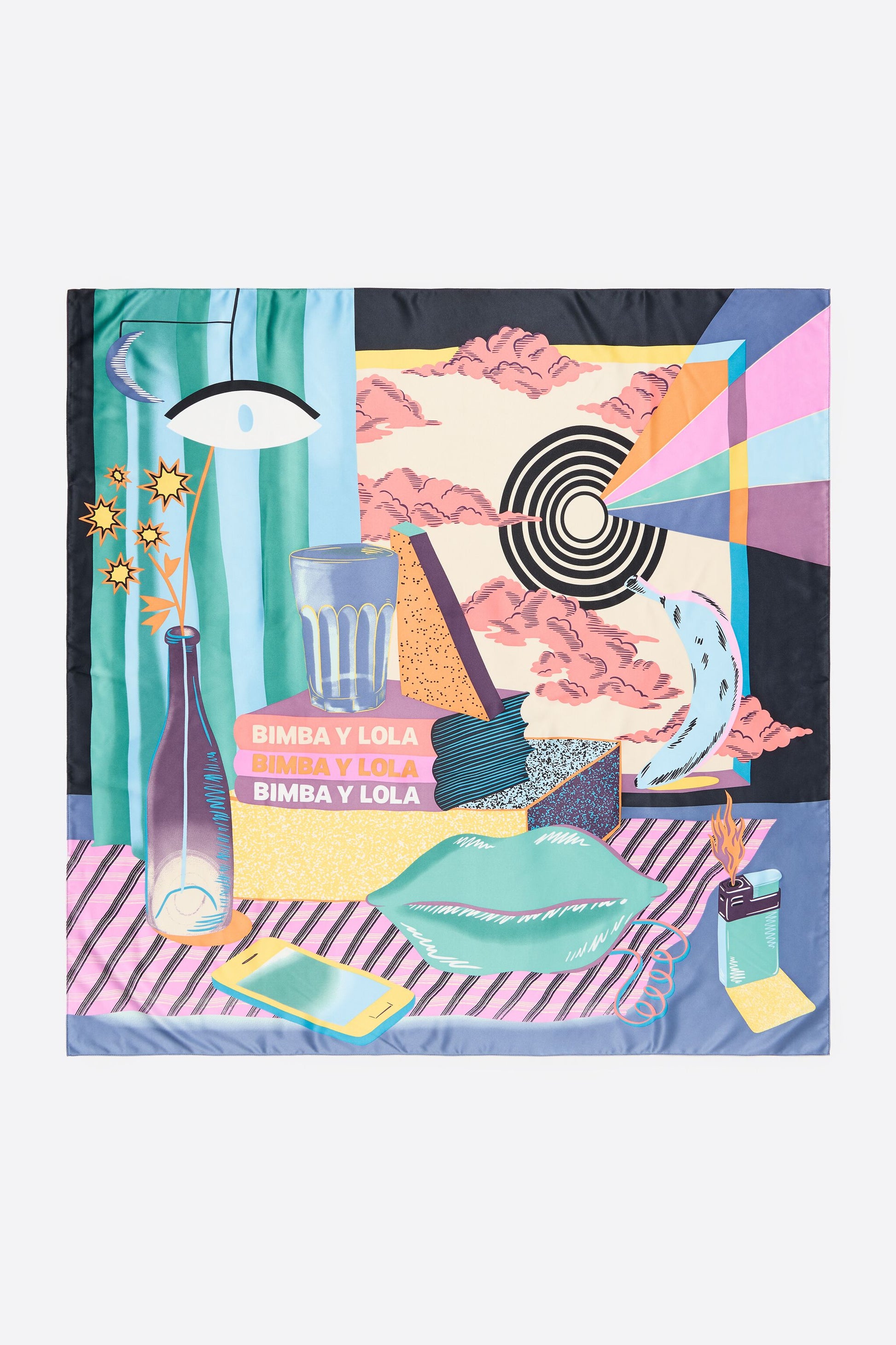 Scarf with surrealist still-life print on an aquamarine background.