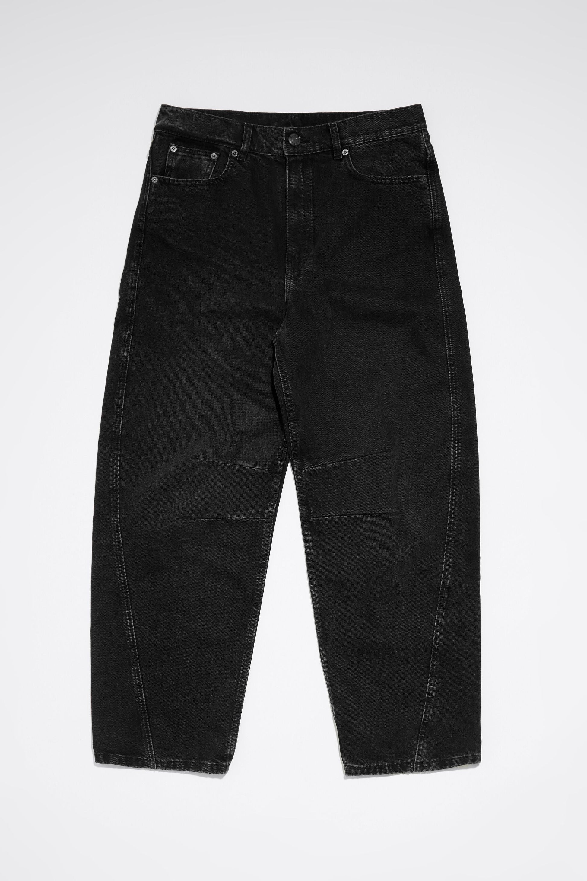 Jeans in washed black. Barrel leg design with irregular side seams, mid rise and five pockets. Metal button and front zip fastener.