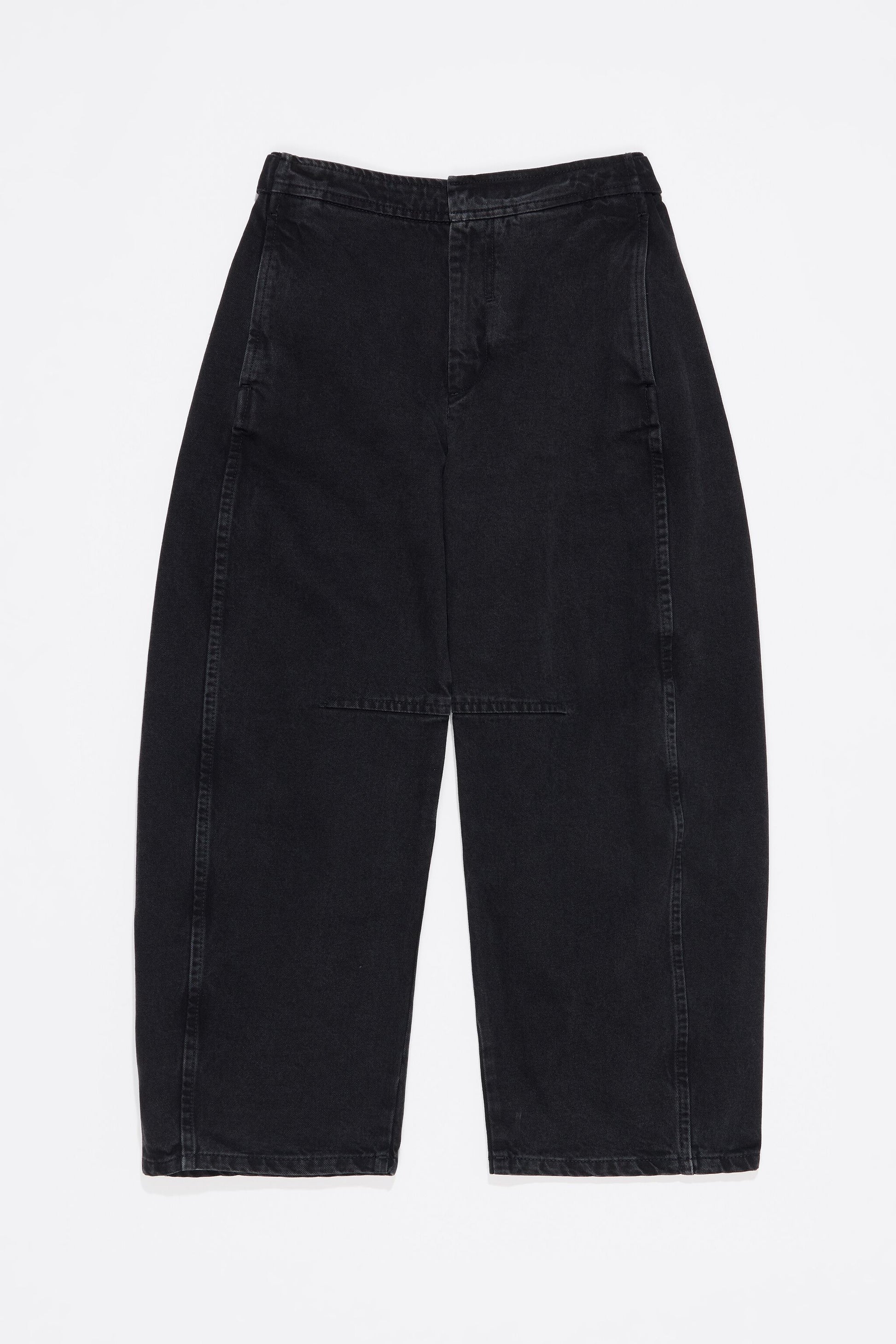 Jeans in washed black. Barrel cut, ankle length, mid rise, side seams and concealed front button and zip fastener. Front pockets with seams and patch back pockets.