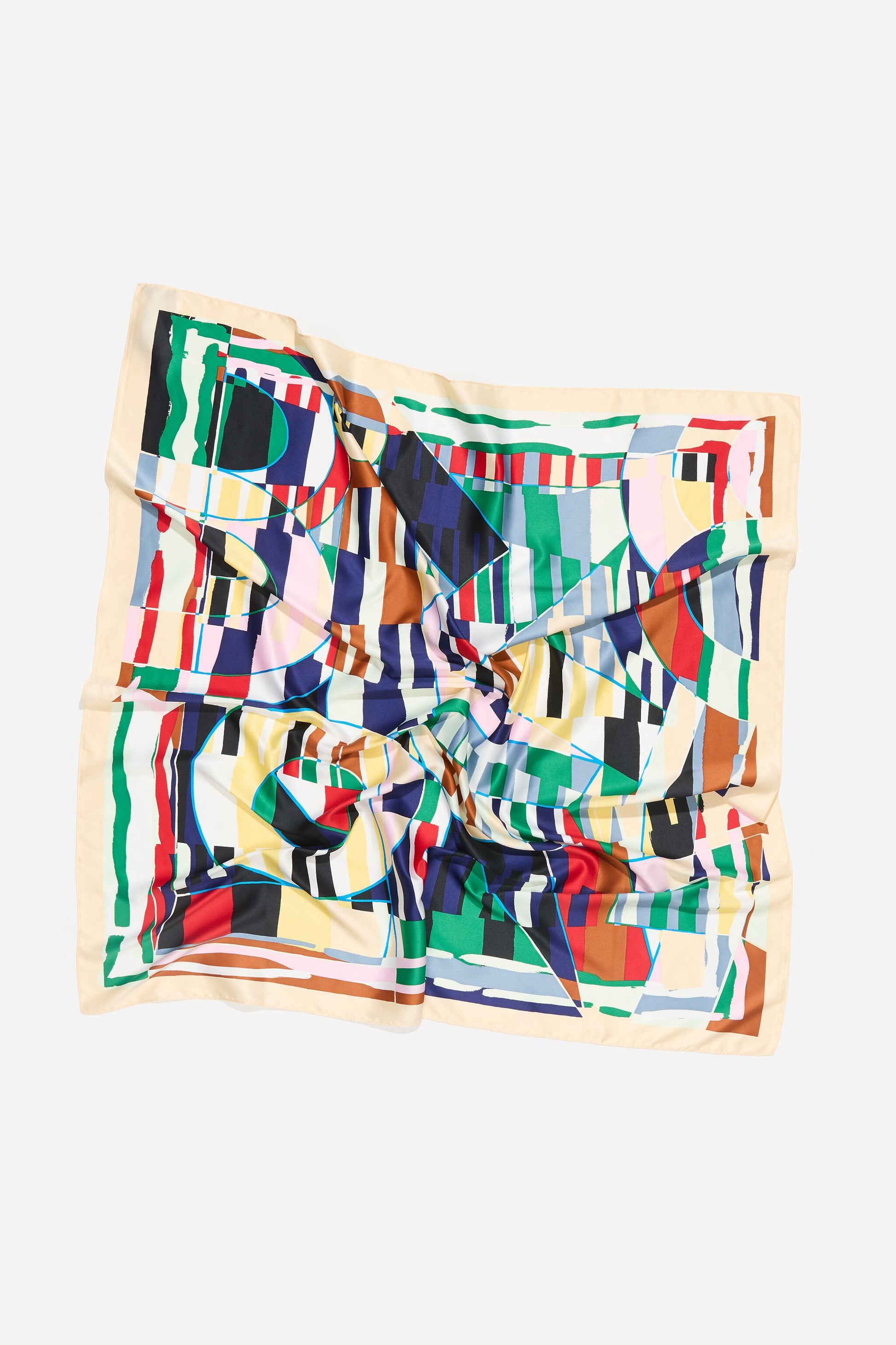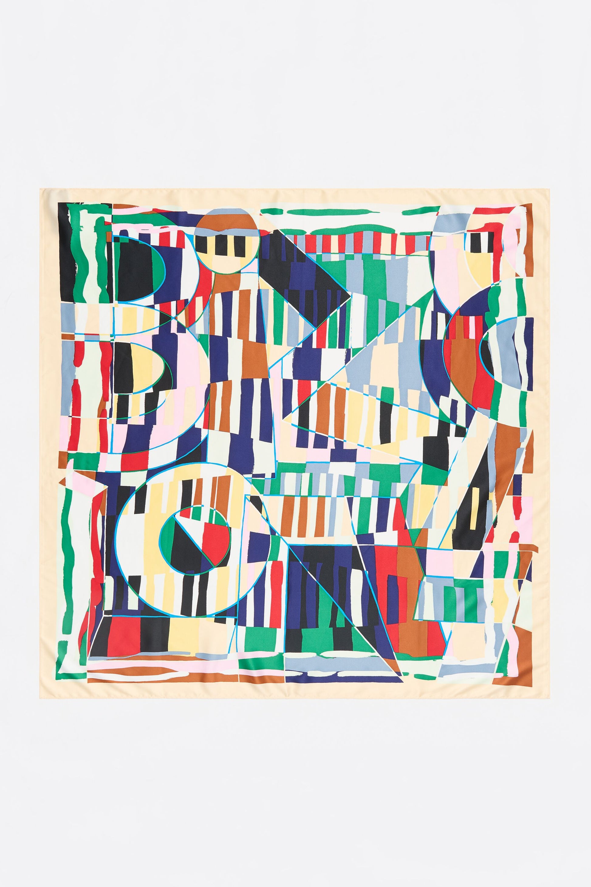 Scarf with geometric print and logo on a beige background. 100% Recycled polyester.