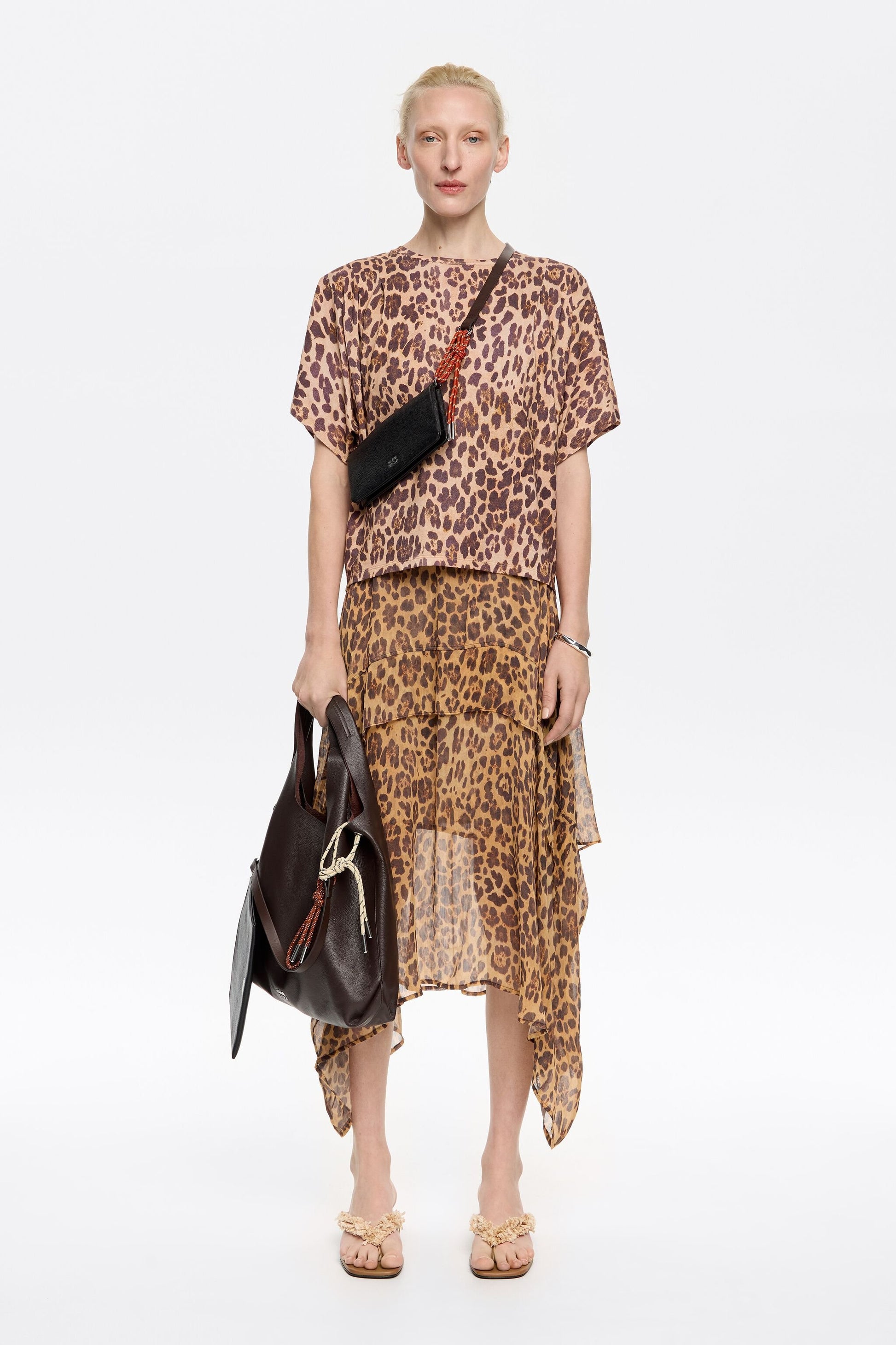 Cotton T-shirt in beige with Leopard print. Boxy cut with crew neck, short sleeve and shoulder pleats.
