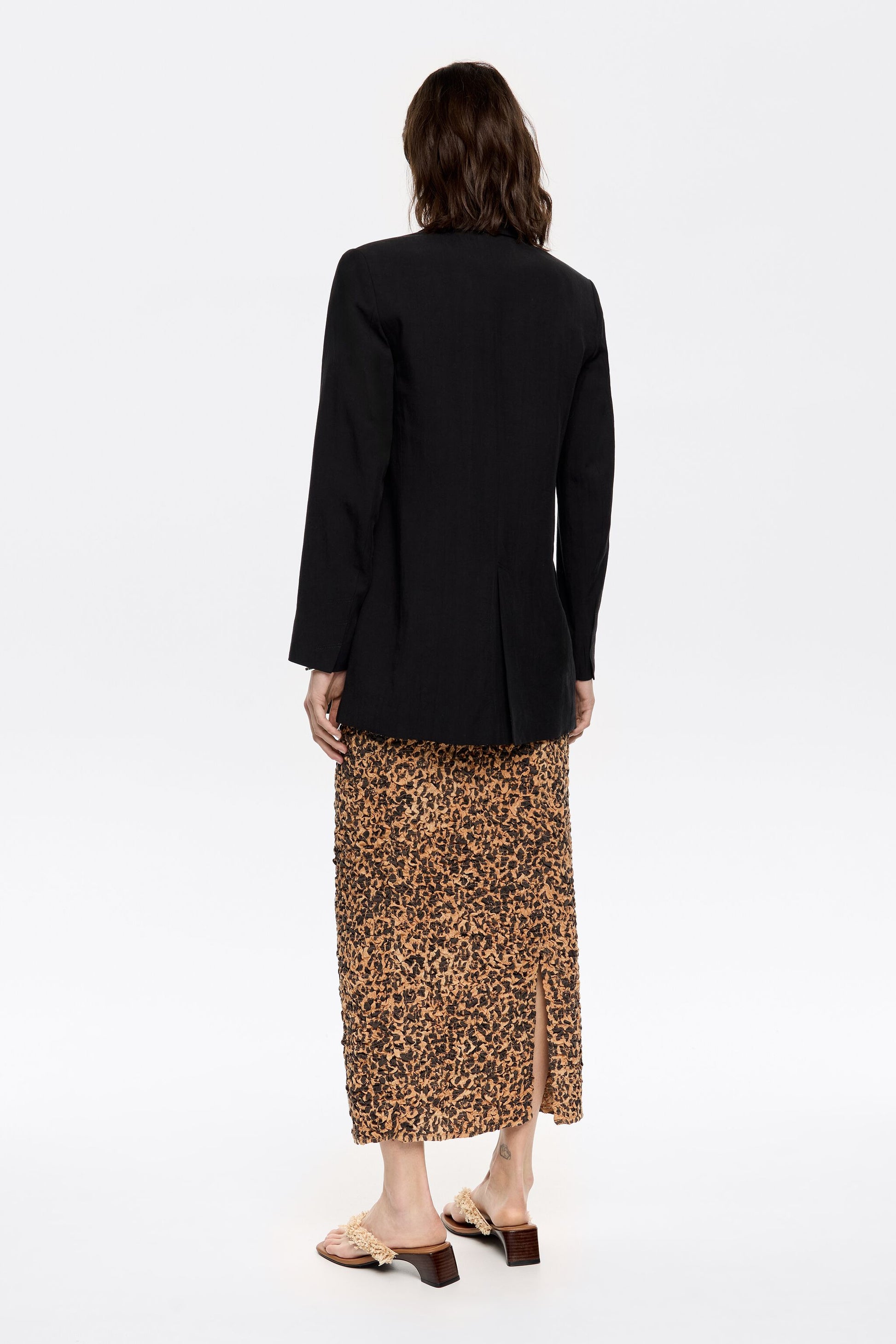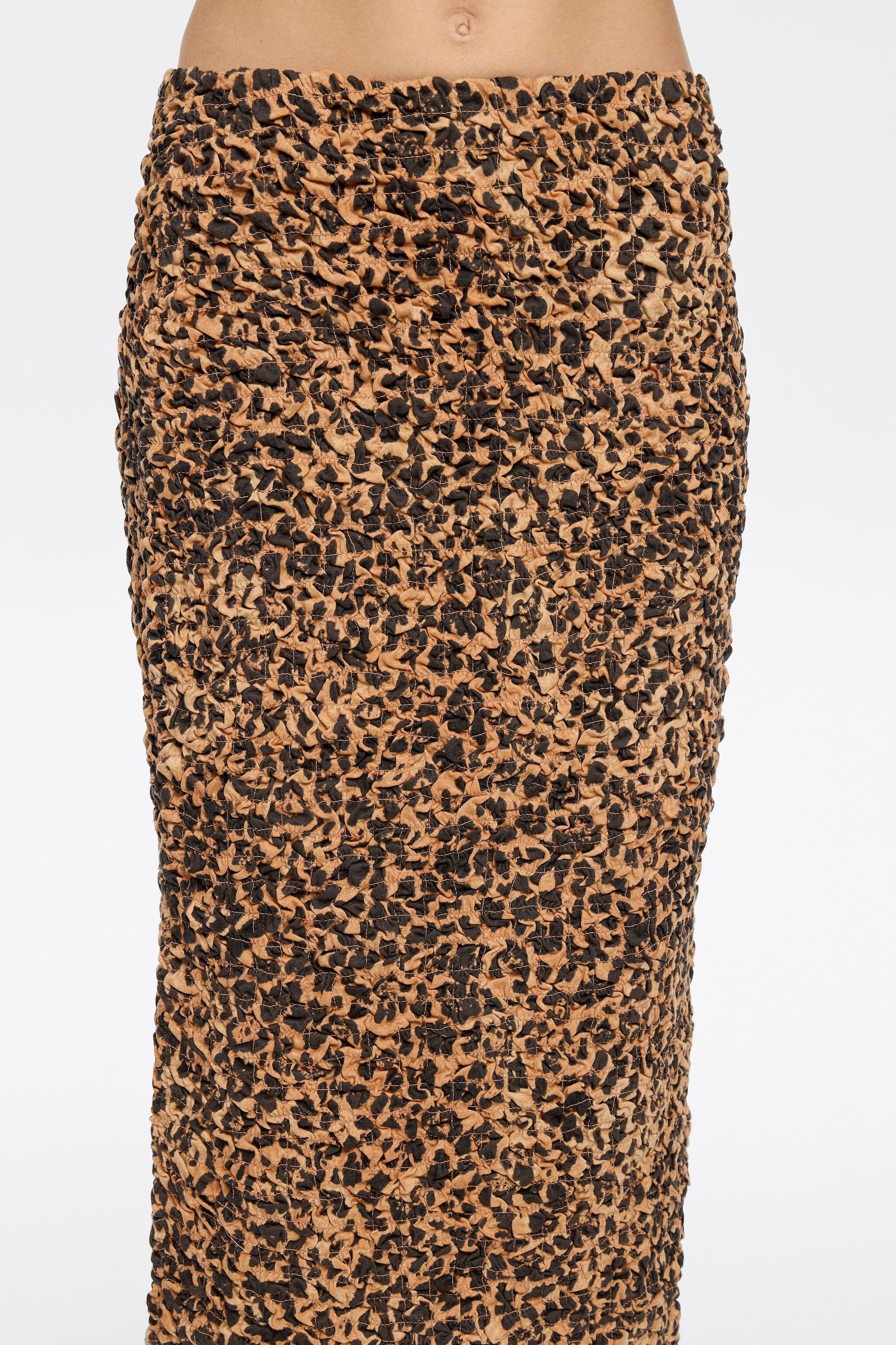 Gathered skirt in beige with Leopard print. Straight, fitted cut, midi length, elasticated waist and back slit.