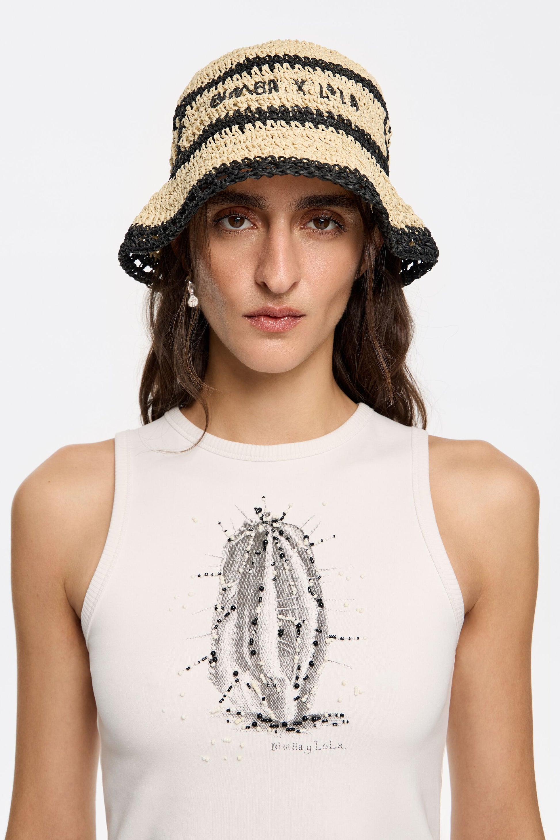 Paper raffia hat in beige. Model customized with embroidered logo.