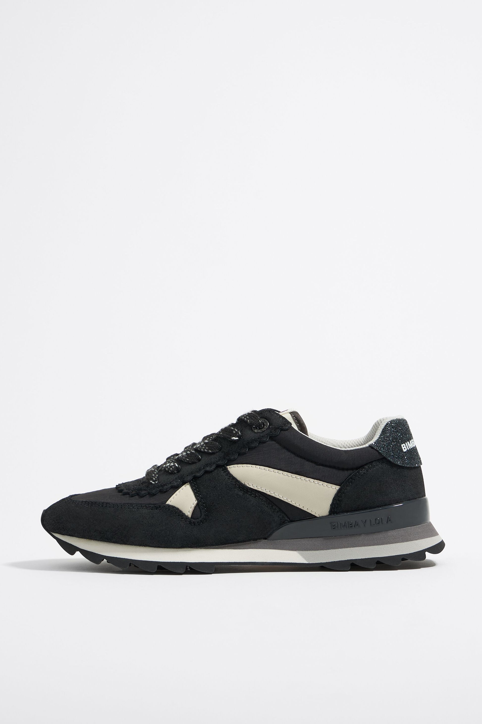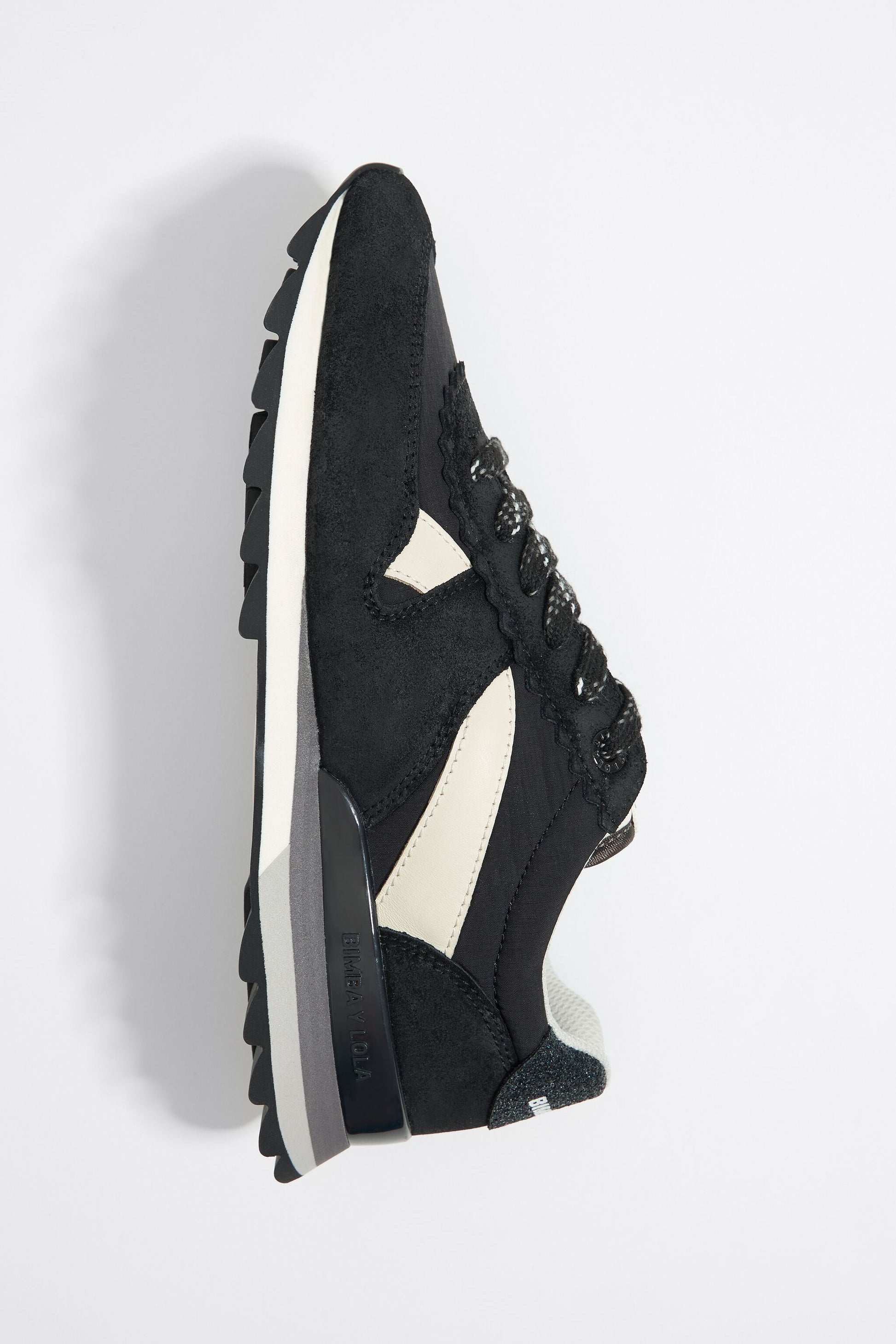 13 19 technical sneaker in black. Model with coated split leather panels combined with technical fabrics. Scalloped upper with leather side logo, logo tongue and glitter back with contrast painted logo. Customized stabilizer, three-tone midsole and sole with serrated finish.
