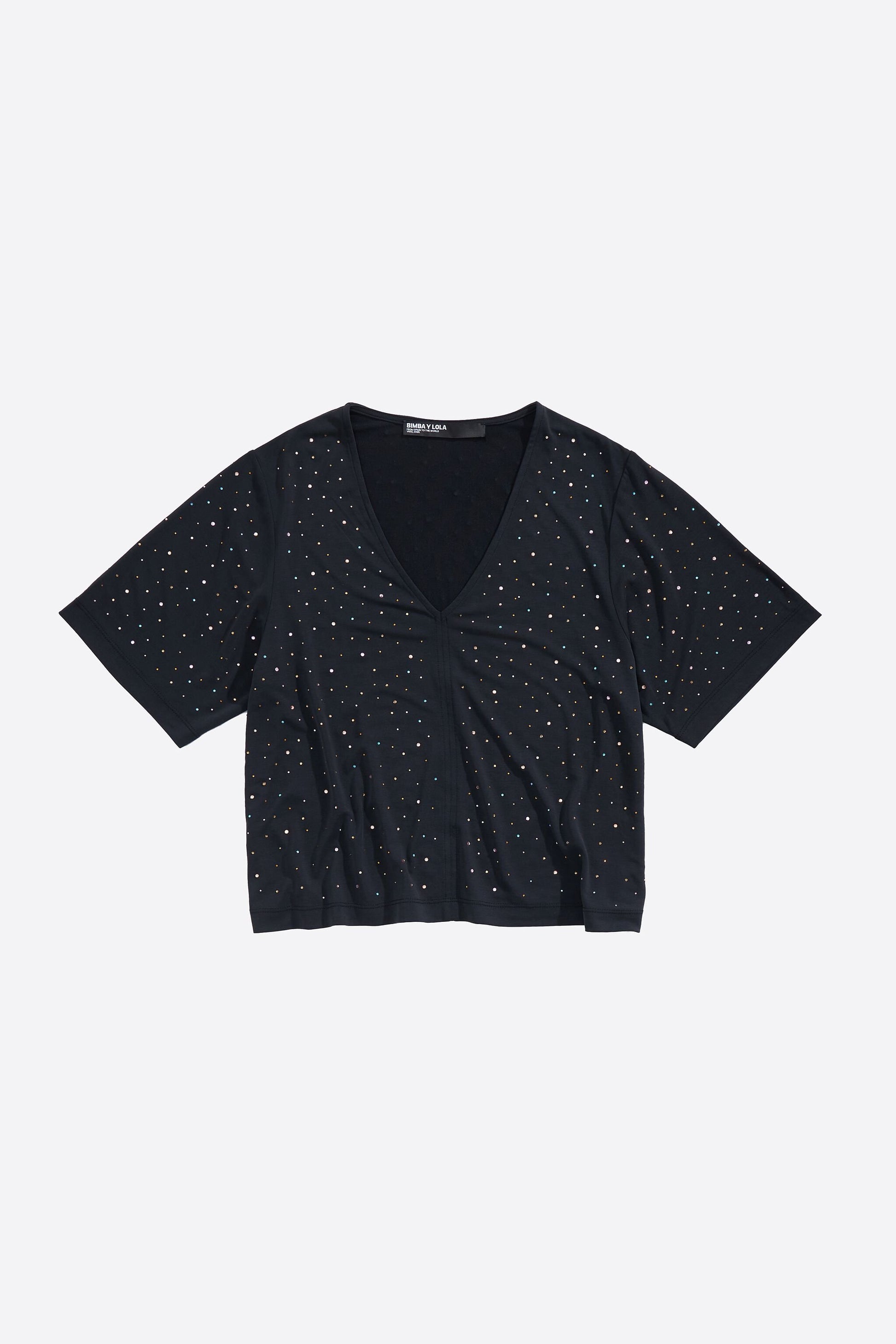 T-shirt in washed black with stones. V-neck with short sleeves and a seam in the center of the back.