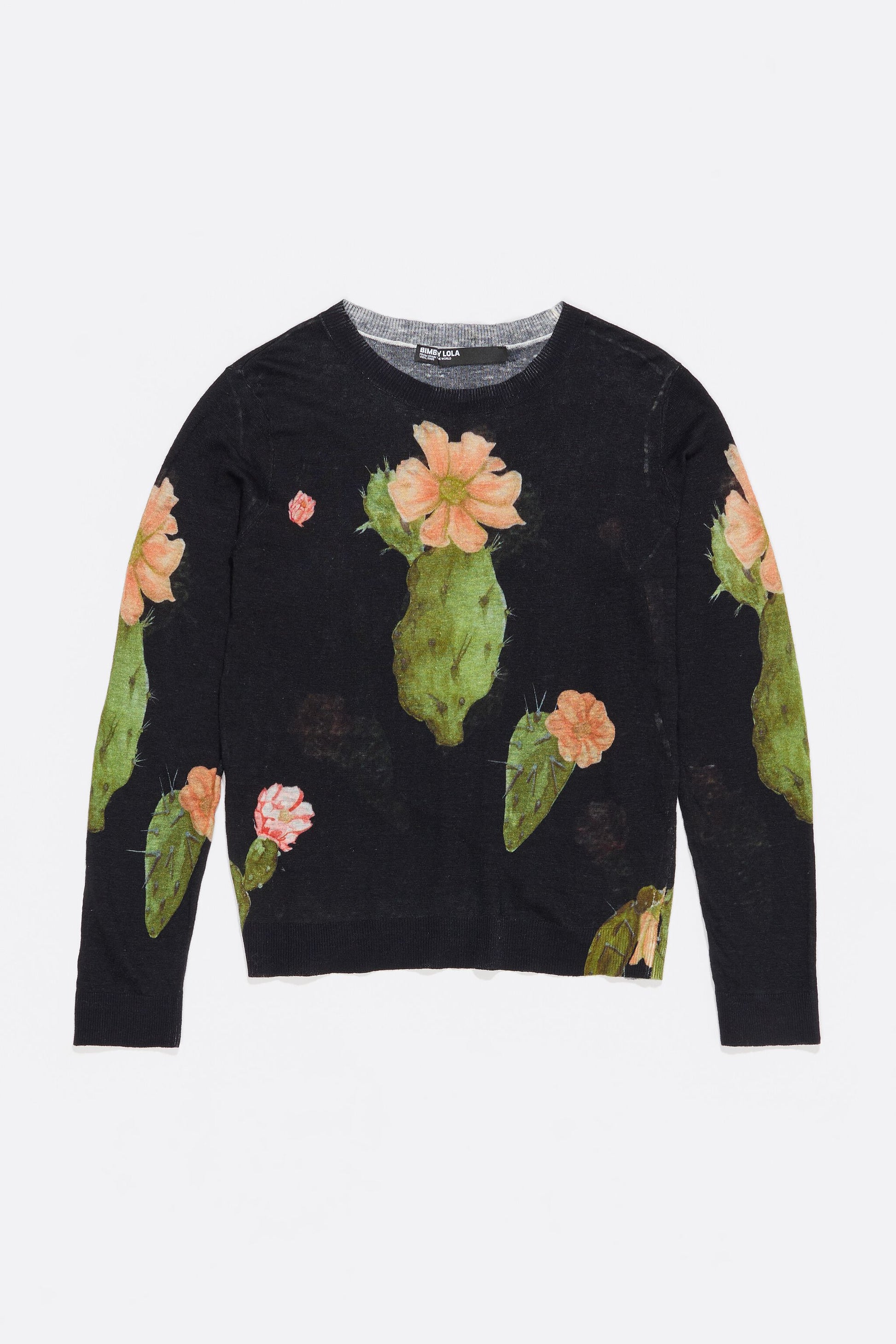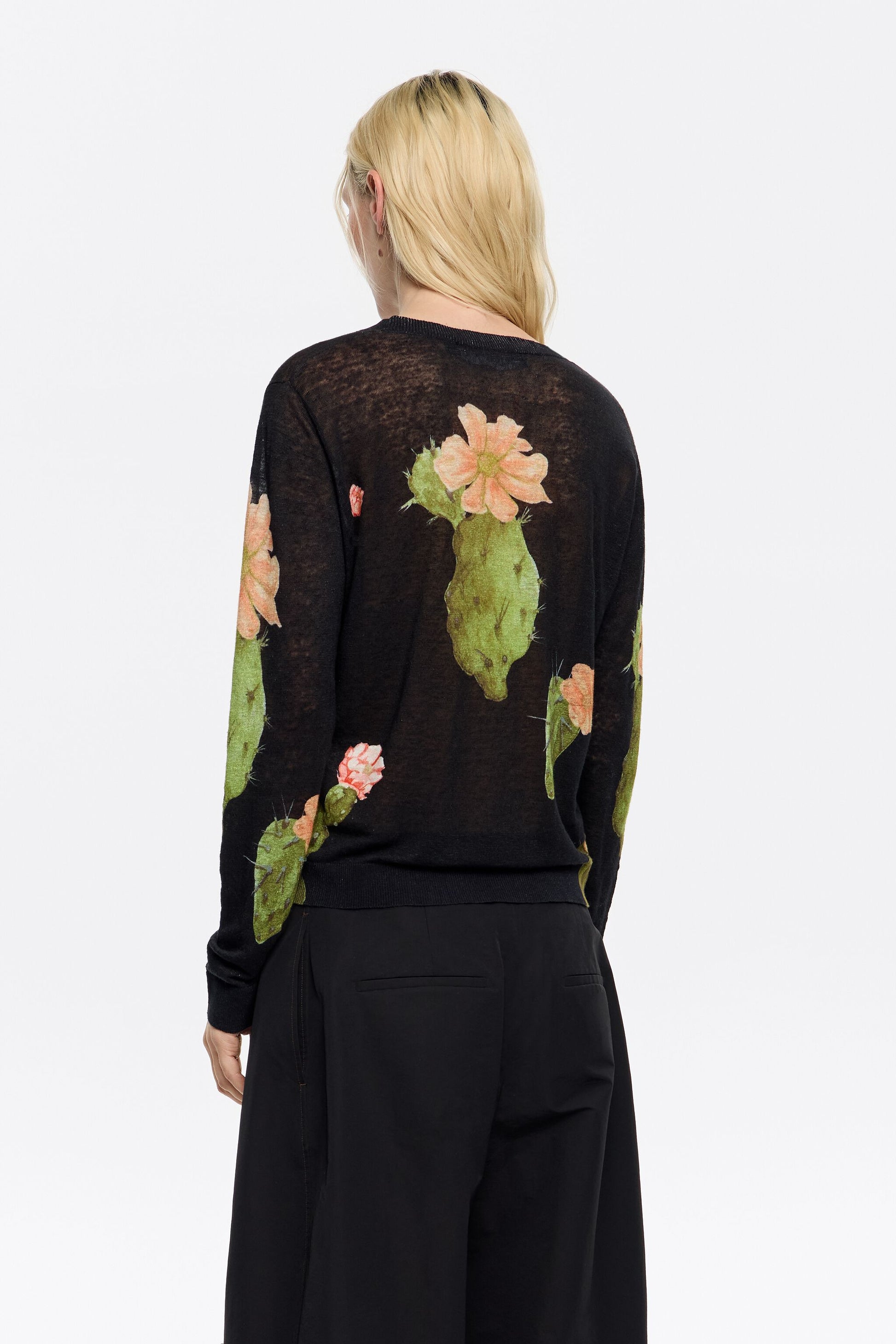 Linen sweater in black with big Cactus print. Straight cut, with crew neck and long fitted sleeve.