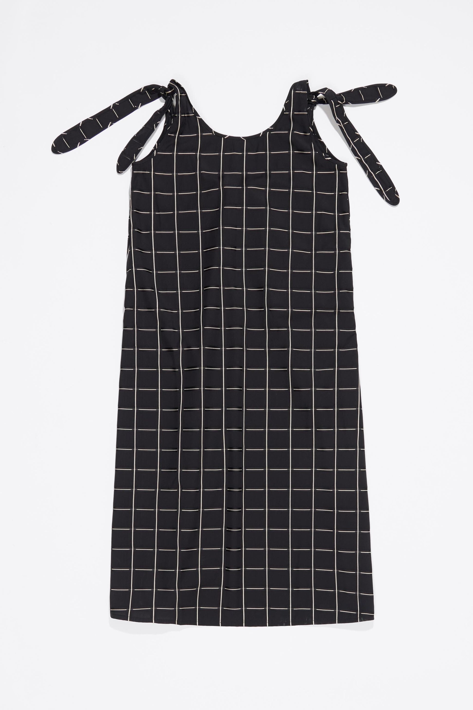 Checked print dress in black. A-line cut with scoop neckline, scoop back and tie straps.