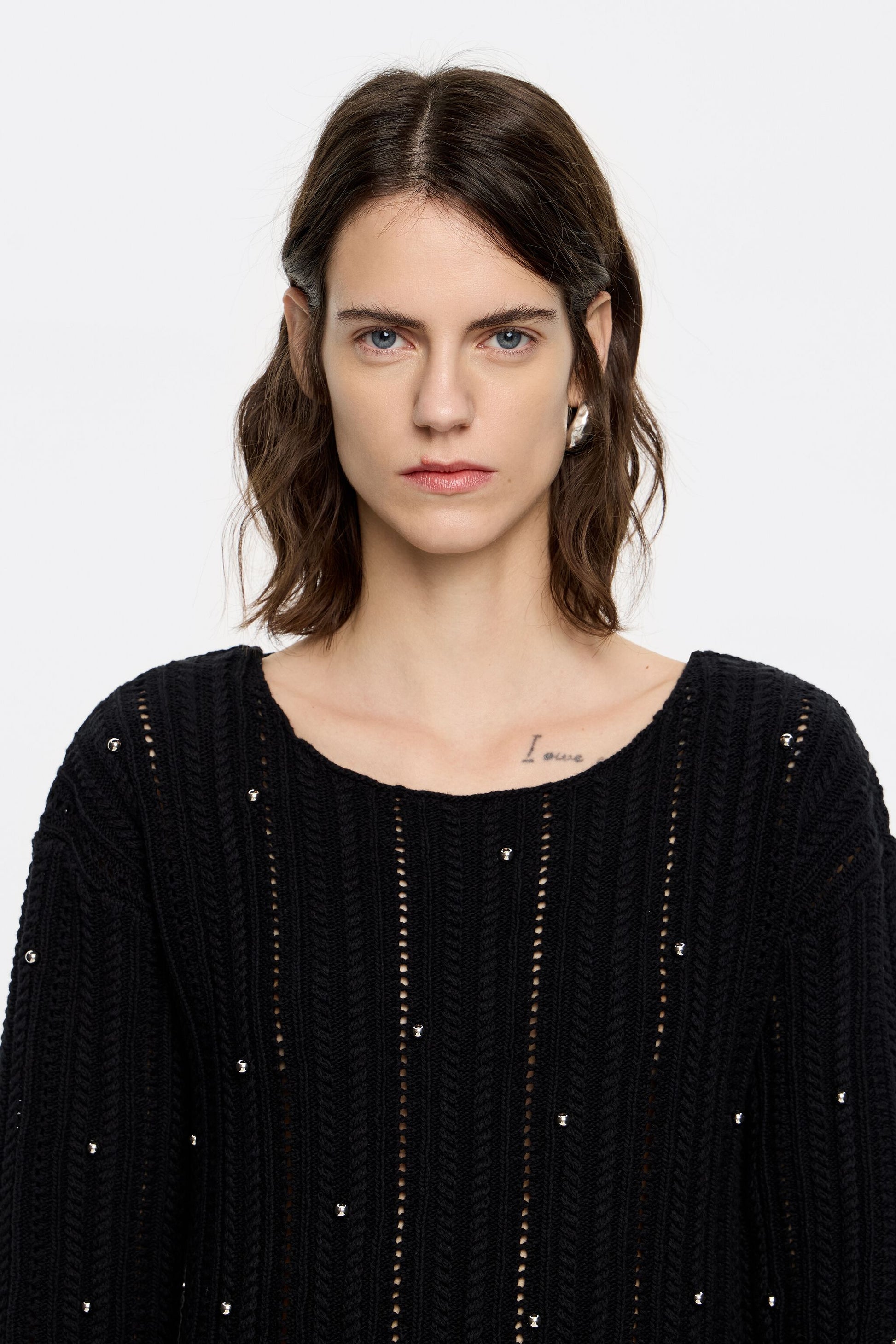 Knit mini dress in black. Straight cut with rounded boat neck, long straight and wide sleeve and all-over metallic beads.