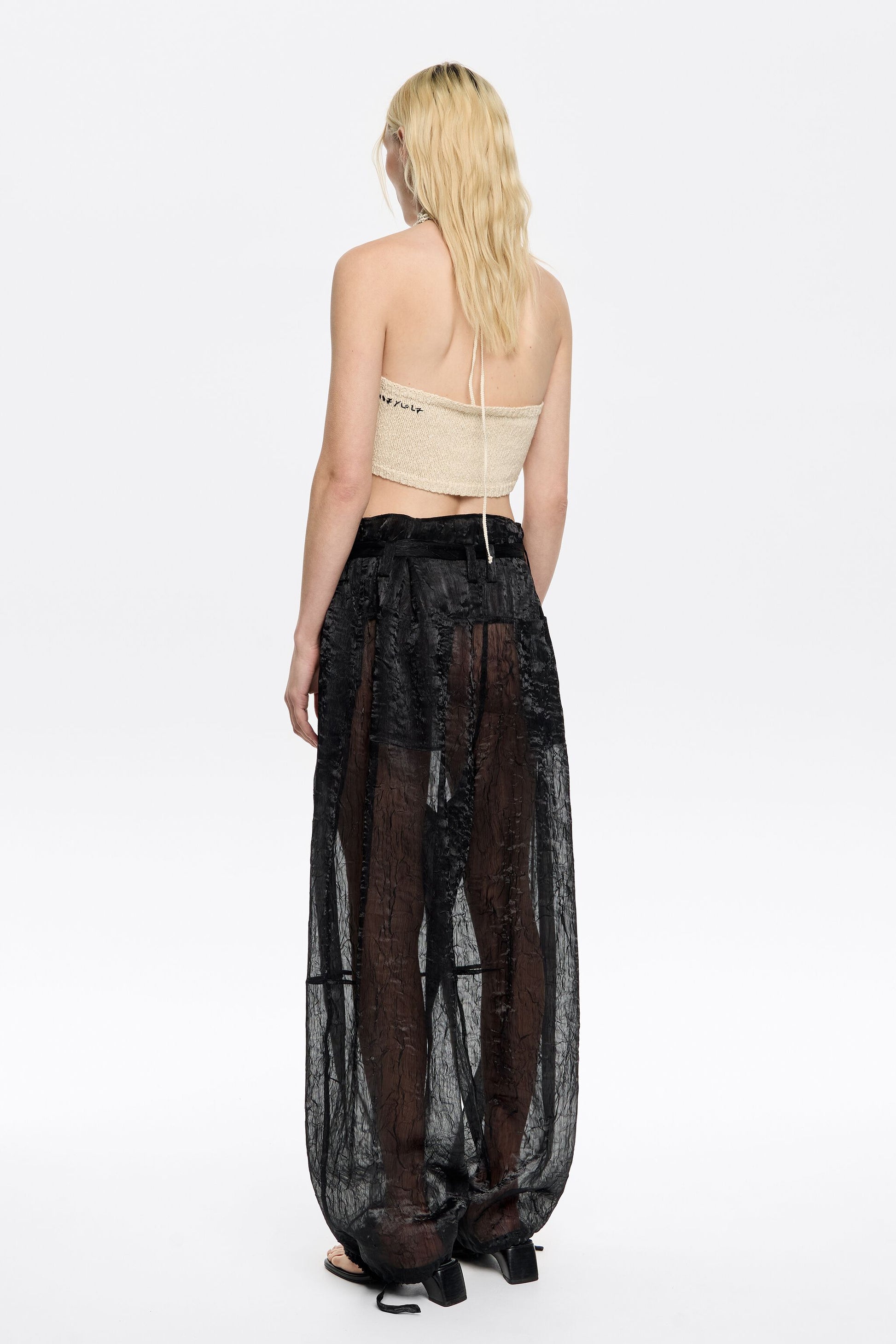 Fancy fabric trousers in black. Harem cut, with concealed side zip fastener, fabric belt and maxi patch back pockets.
