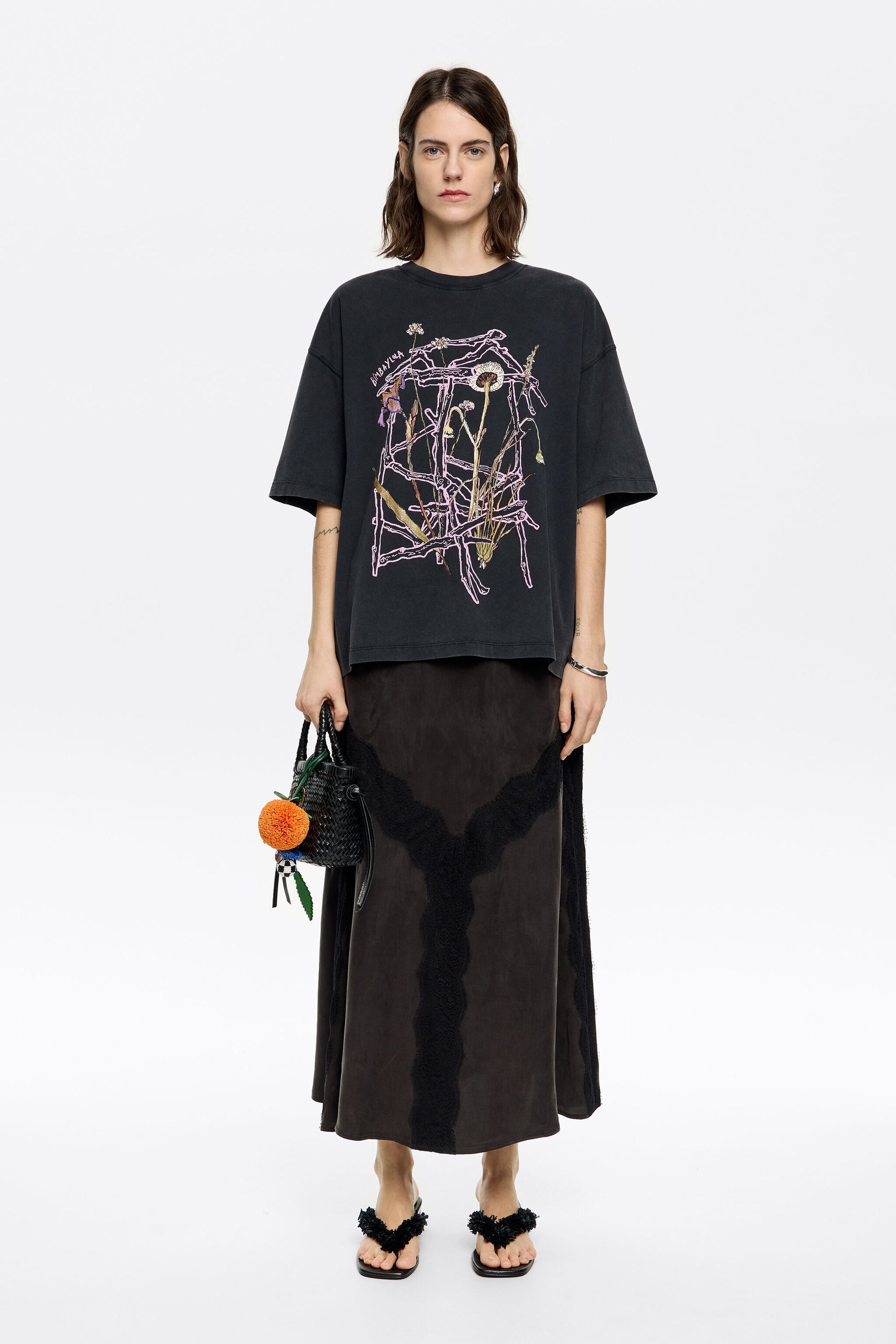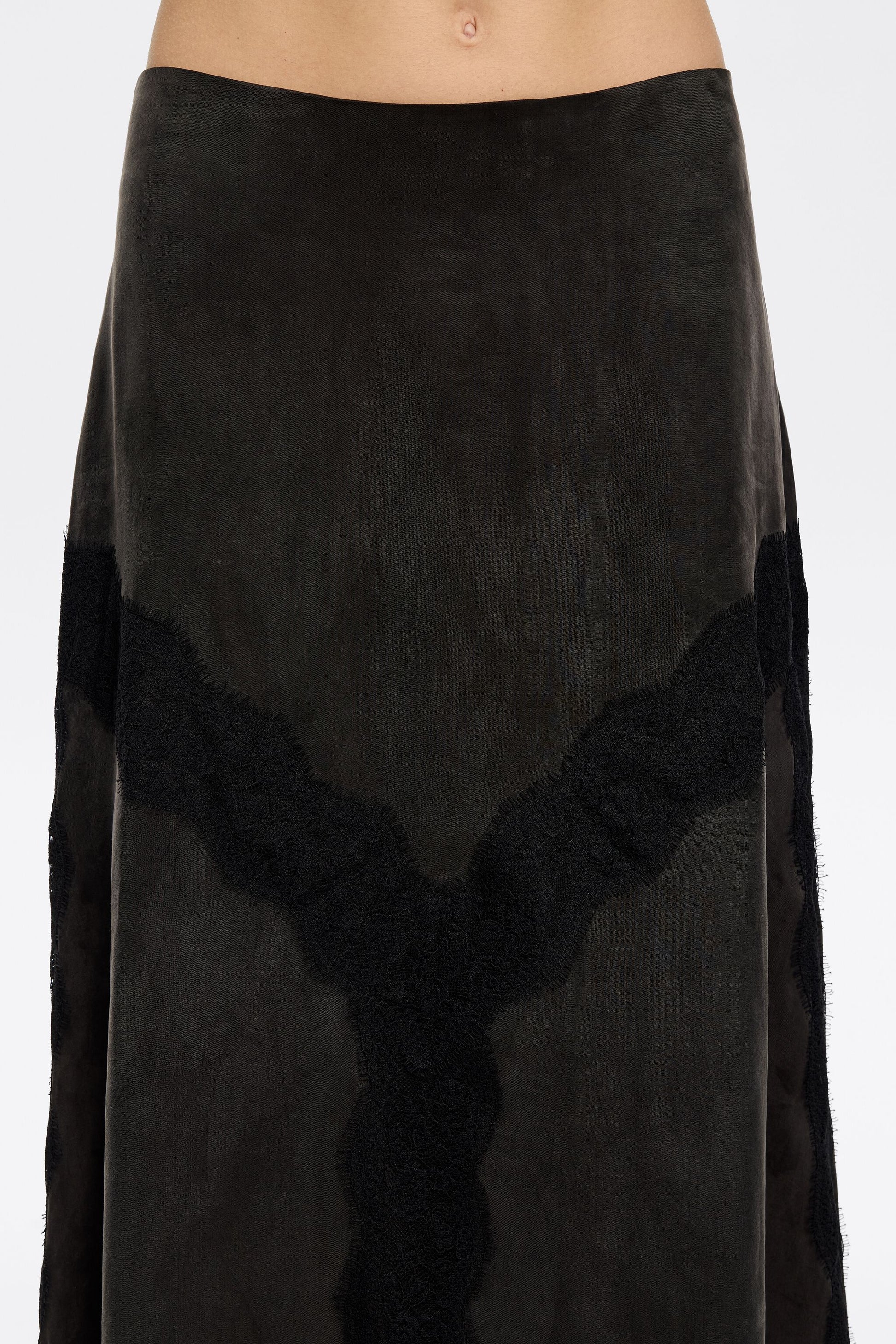 Lyocell flared skirt in washed black. A-line, midi length and concealed back zip fastener. All-over lace detailing.