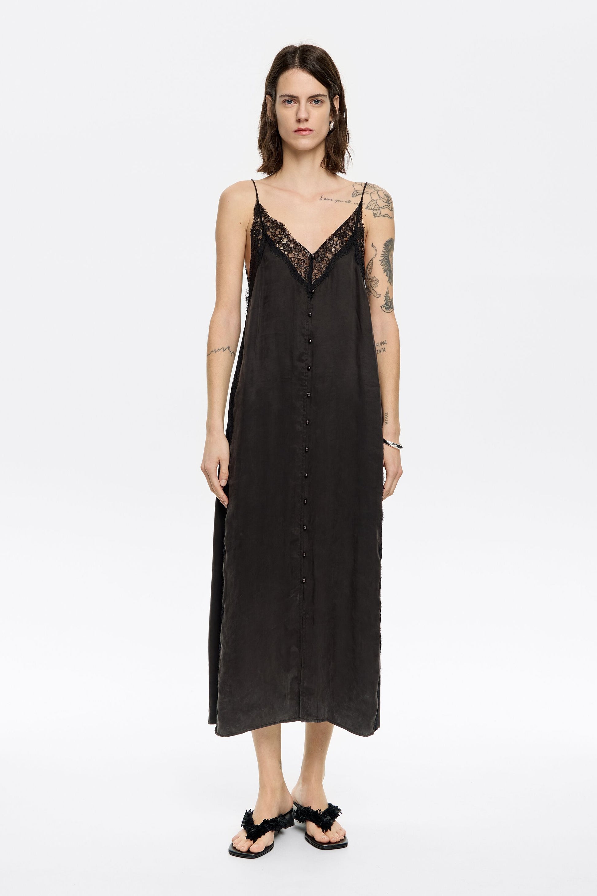 Viscose midi dress in washed black. Straight cut with lace V-neck, fabric straps and button-up front. Lace trim sides. This model contains 100% responsibly produced Lyocell.