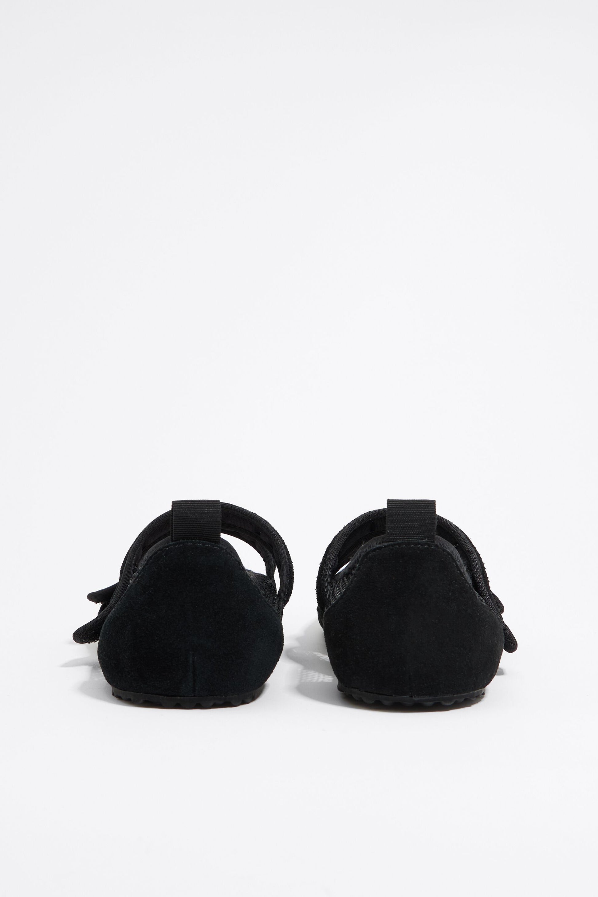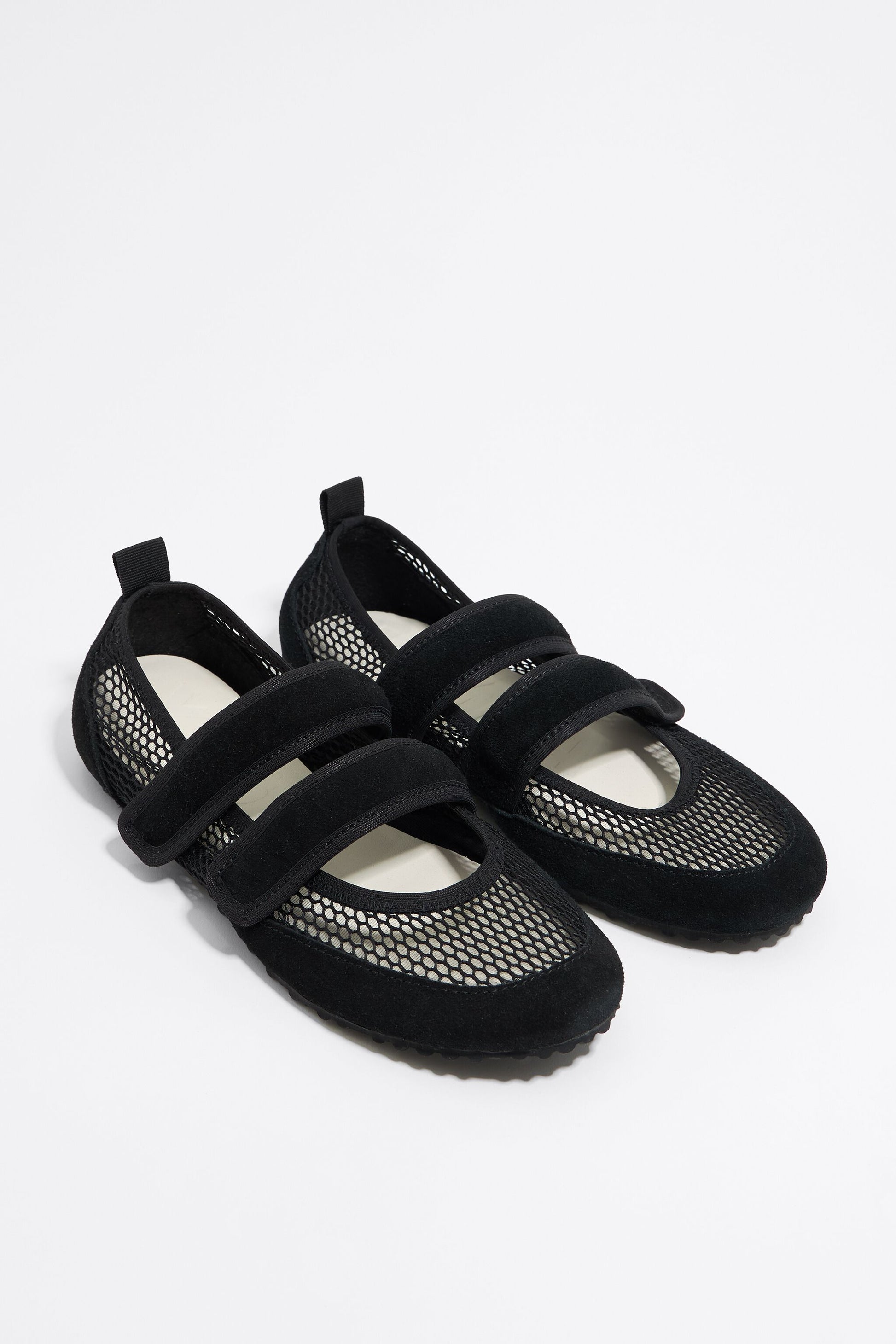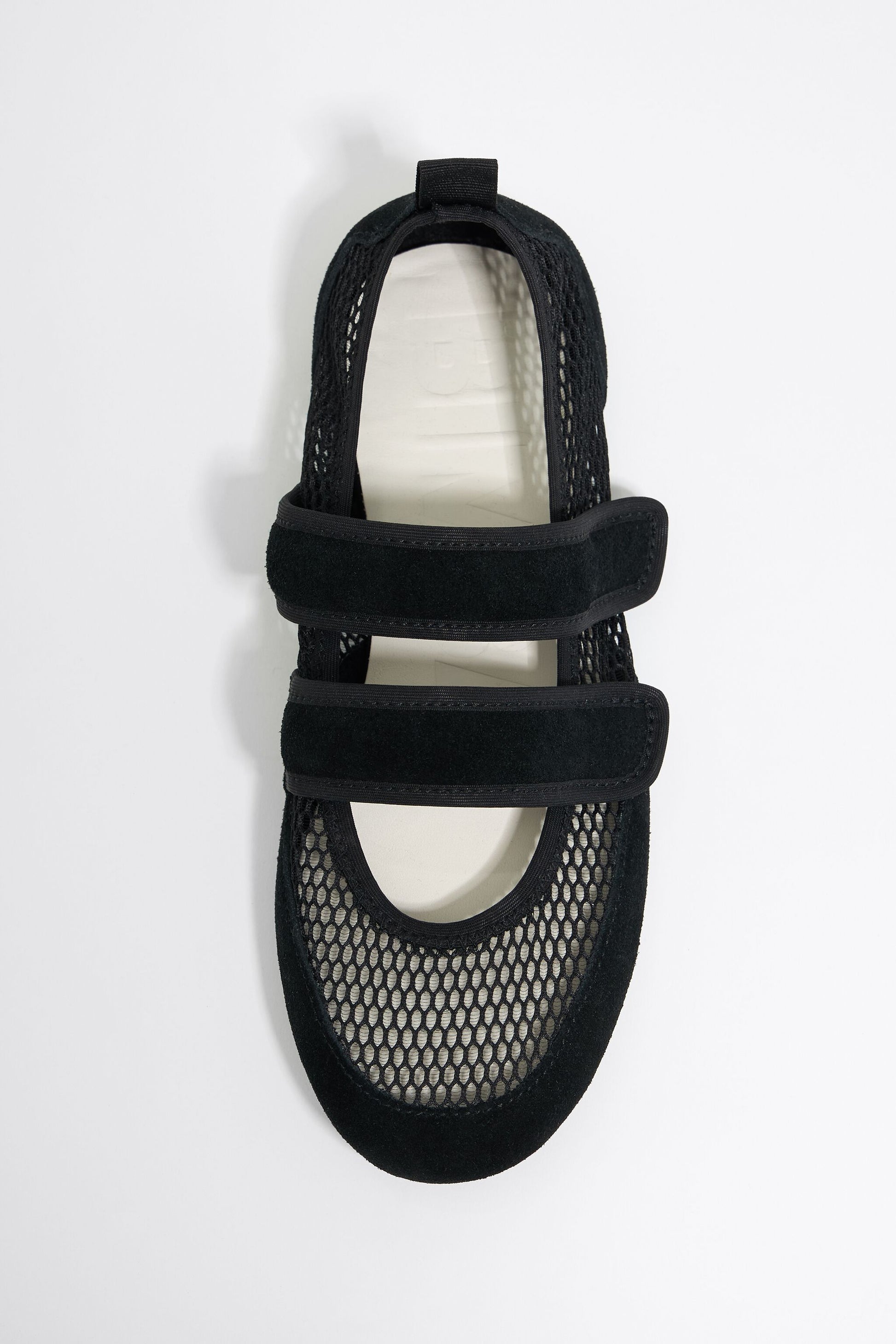 Sporty ballerina in black net. Model made with pieces of split leather and black net with a double-velcro fastener. Raised insole with engraved logo and rubber sole.
