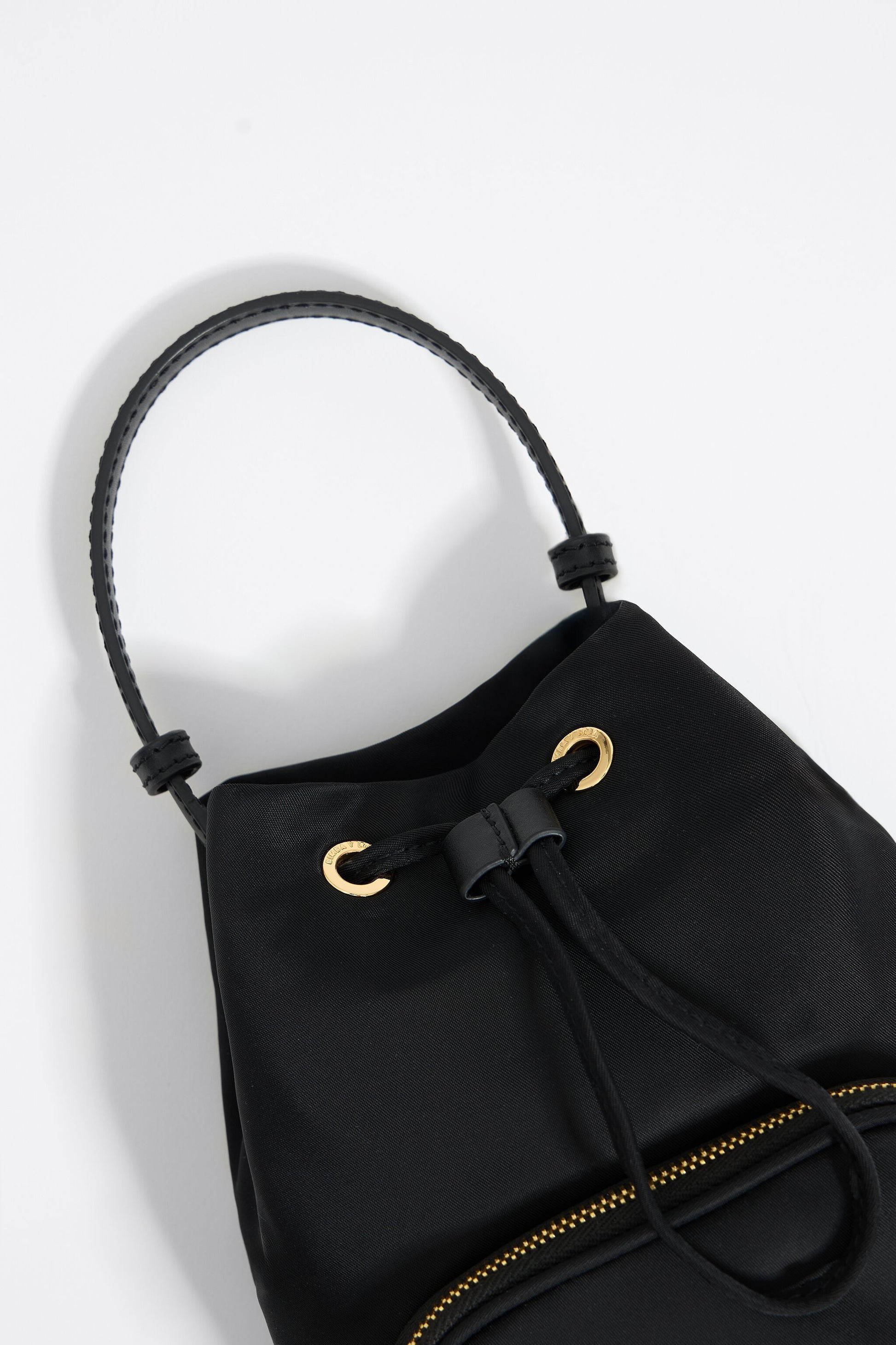 Nylon bucket bag in black. Model with adjustable fastener, leather strap, interior pocket and leather pieces. Exterior customized with metallic logo.