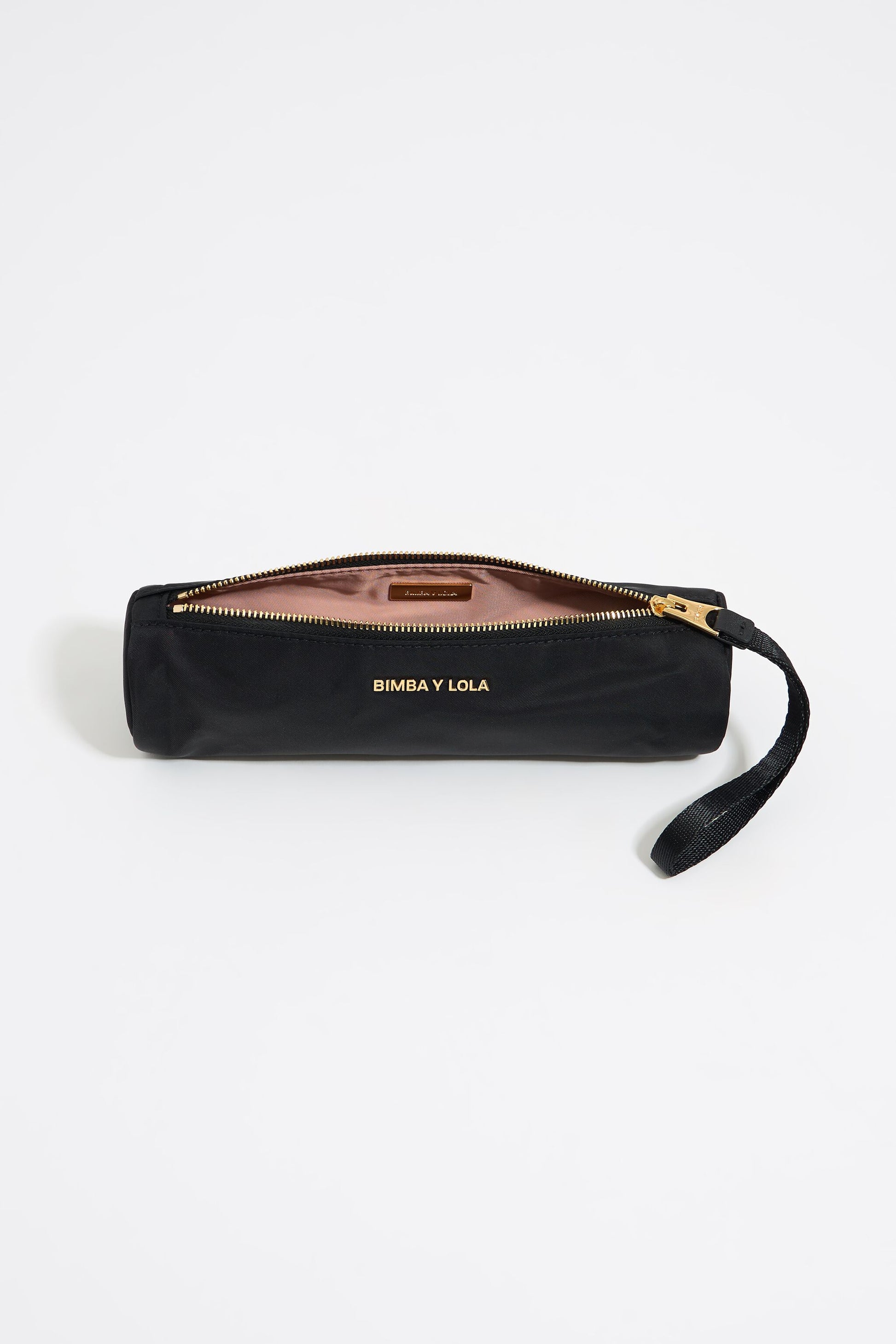 Nylon cylindrical make-up case in black. Model with zip fastener, fabric strap and exterior customized with metallic logo.