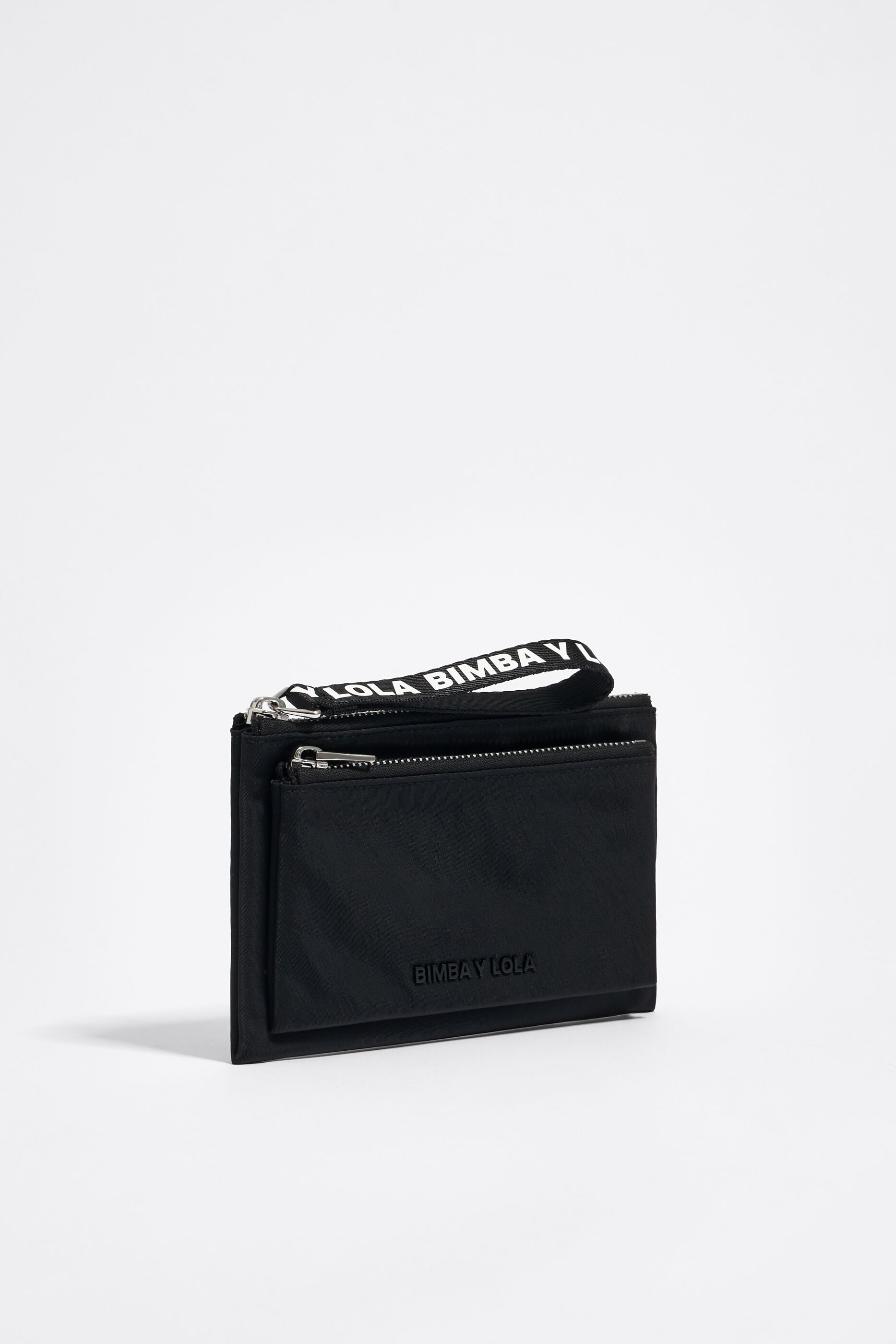 Nylon purse in black. Model with a front zip pocket, pull with logo and a triple interior cardholder. Exterior customized with metallic logo.