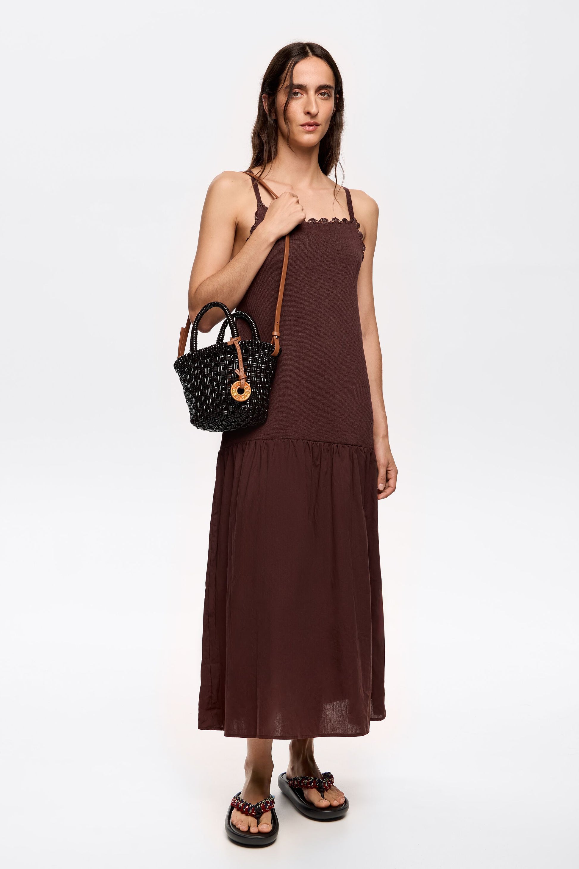 Plaited shopper bag in black. Model with leather strap with ceramic Chimo logo charm. This model contains 100% Responsibly produced polyurethane