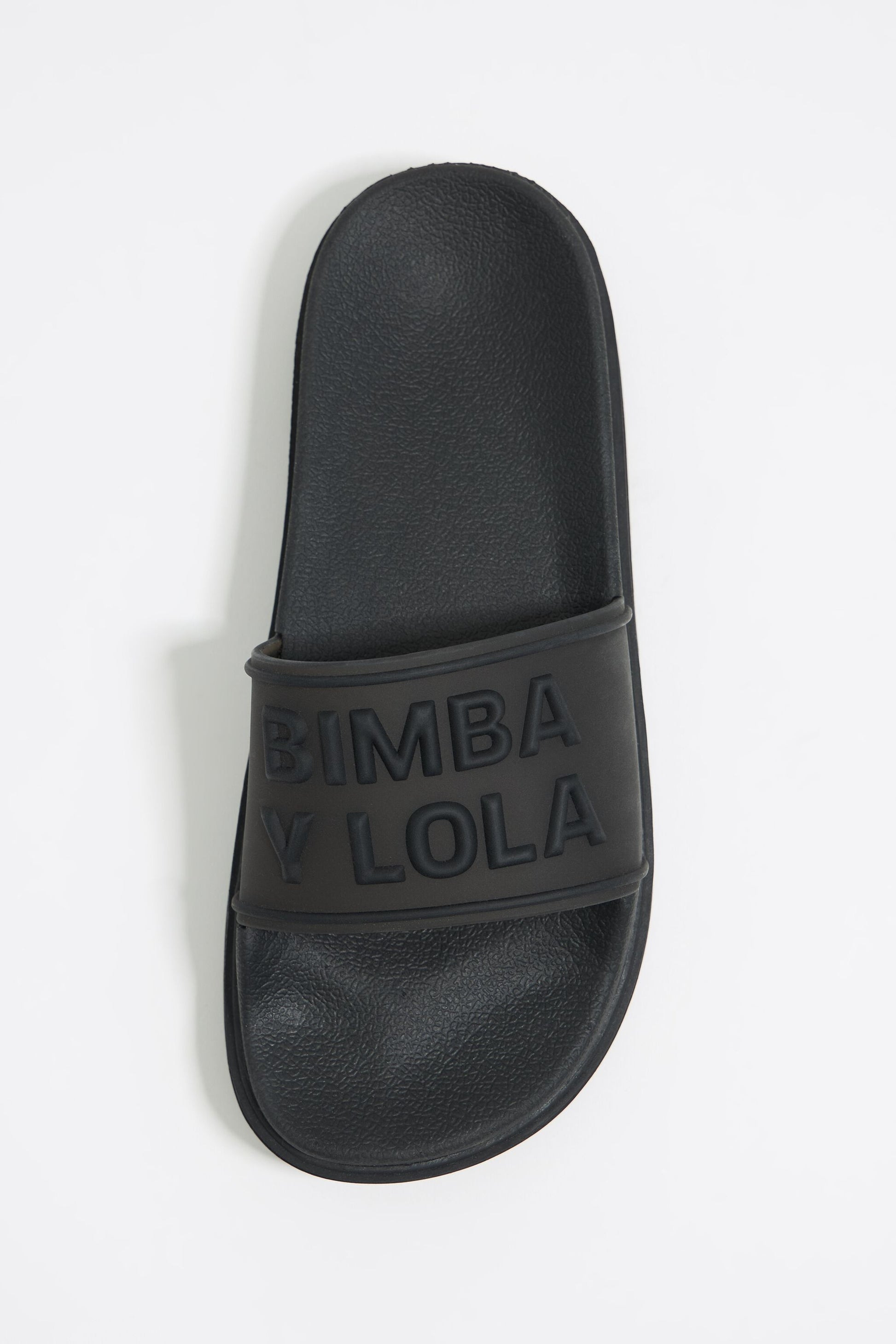 Platform slider in black with tonal logo. Strap with logo on a semi-transparent background. Logo sole with serrated finish.