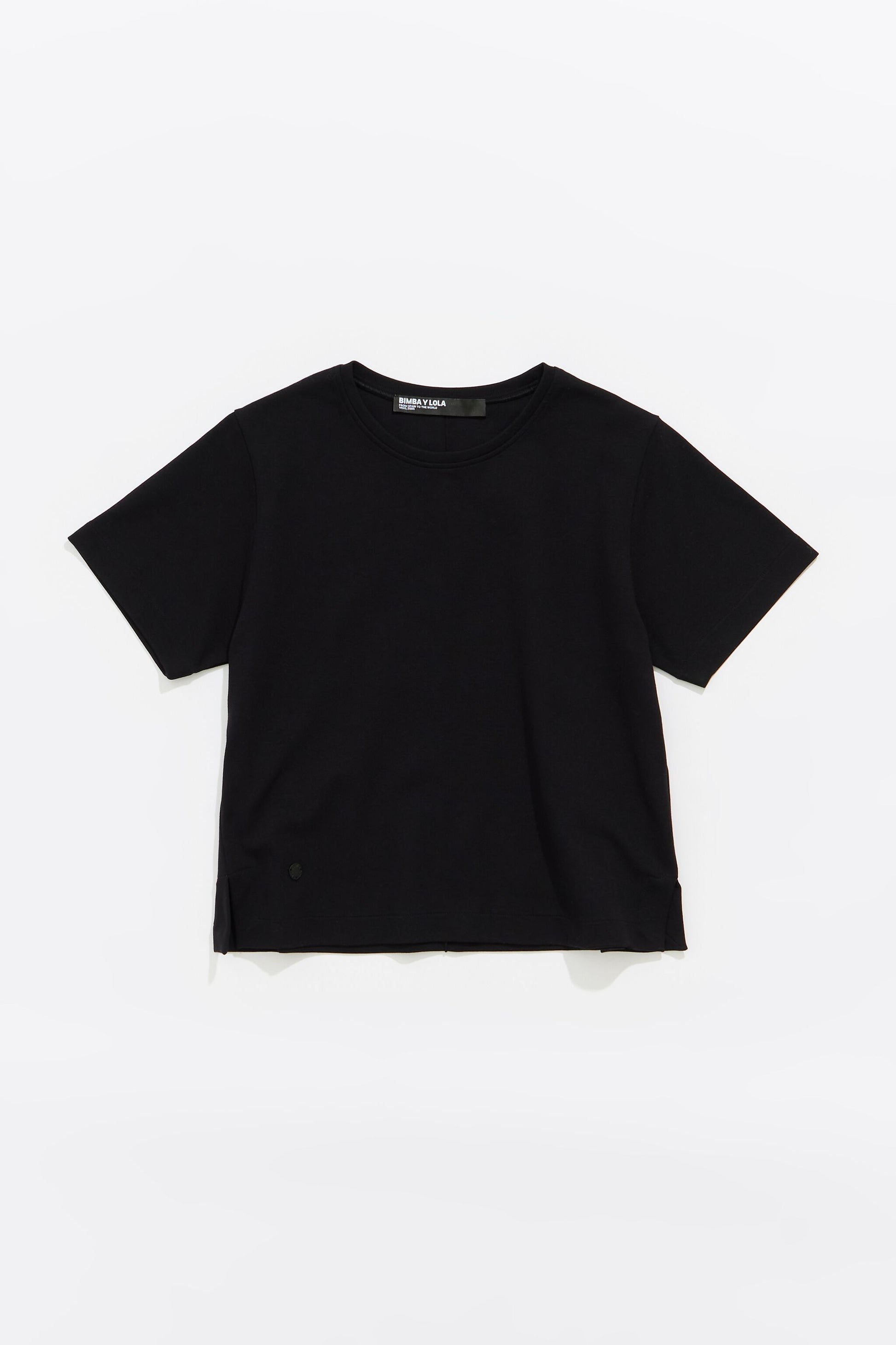 Short ponte di roma top in black. Straight-cut model with a crew neck, short sleeves and small side openings. Exterior customized with metallic logo.
