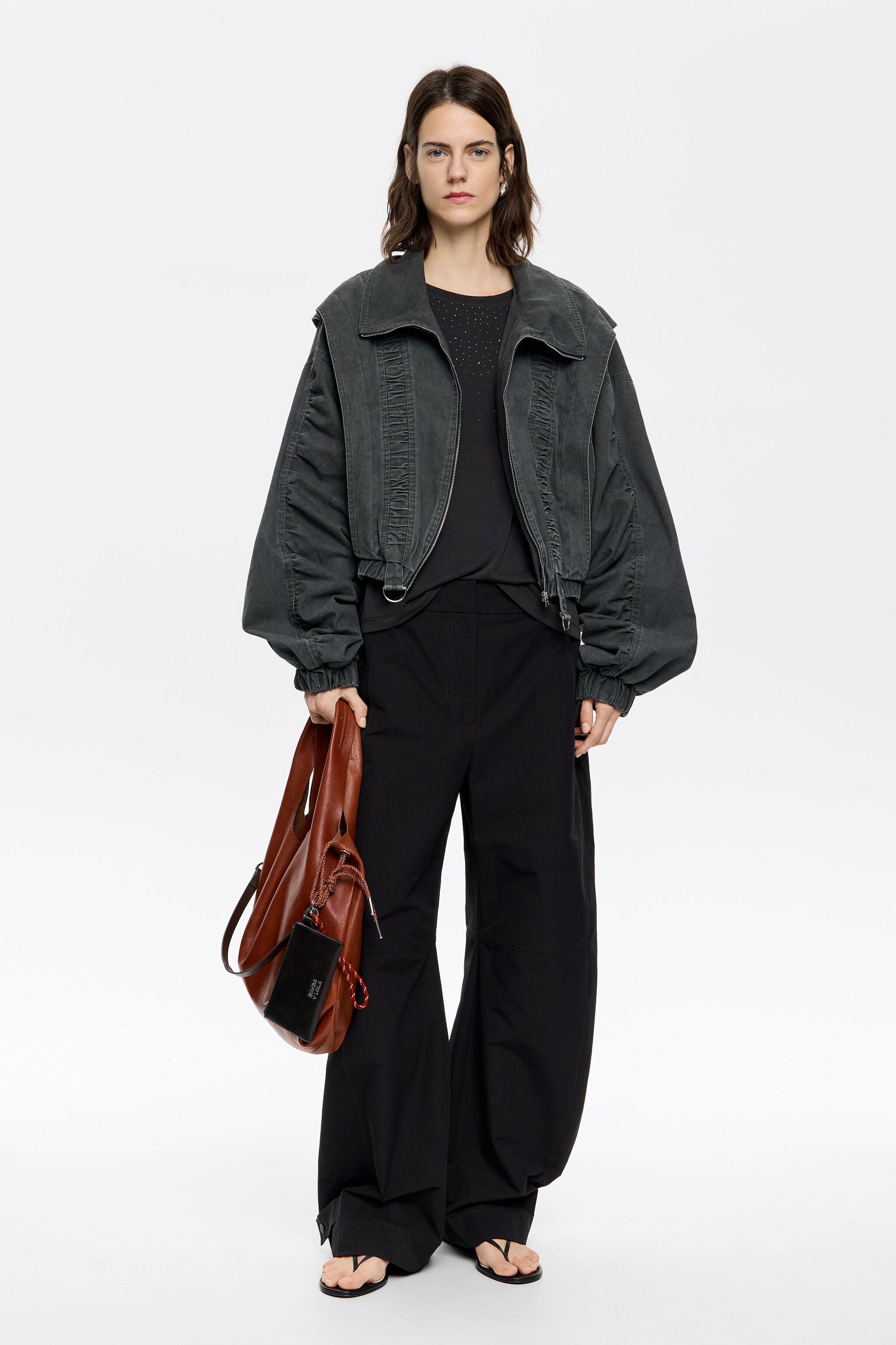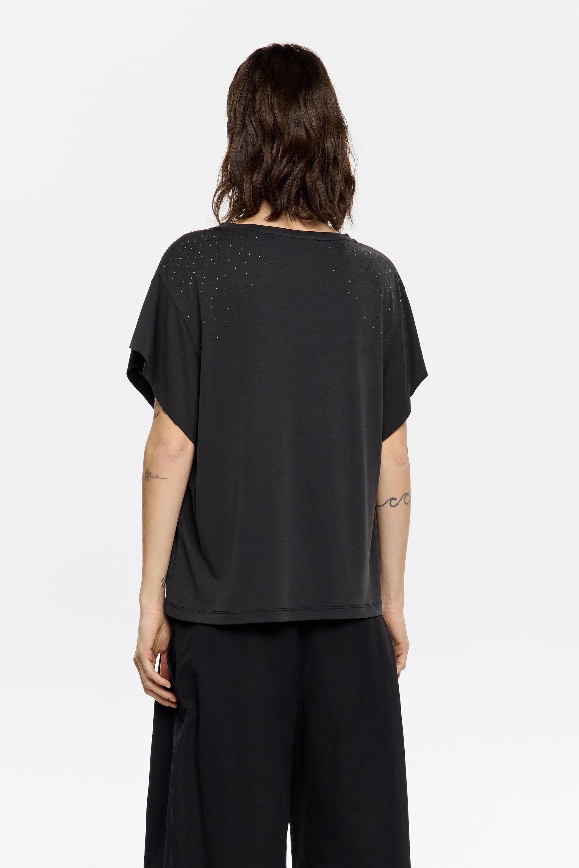 Viscose T-shirt in washed black. Straight cut with crew neck and short straight sleeve. Rhinestone detailing on the shoulders, front and back. 100% Recycled polyester.