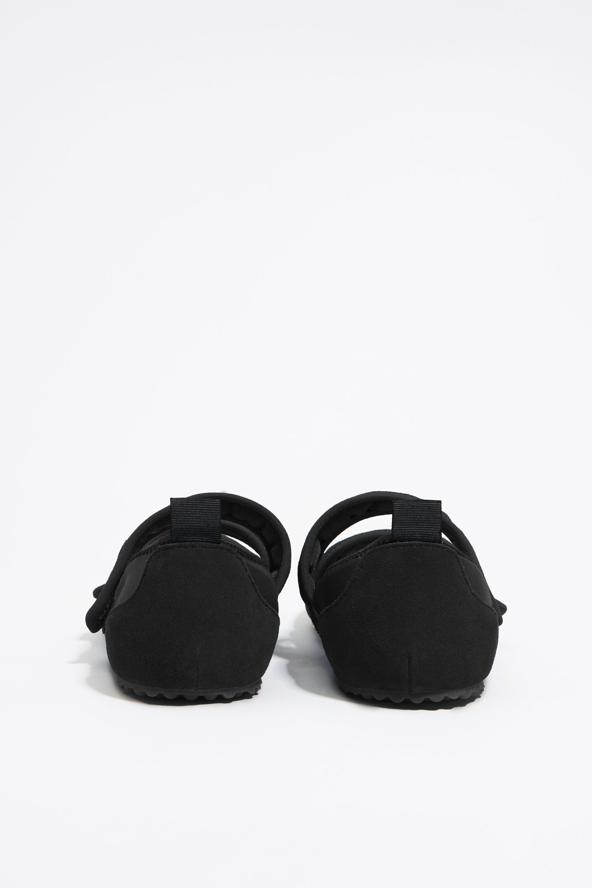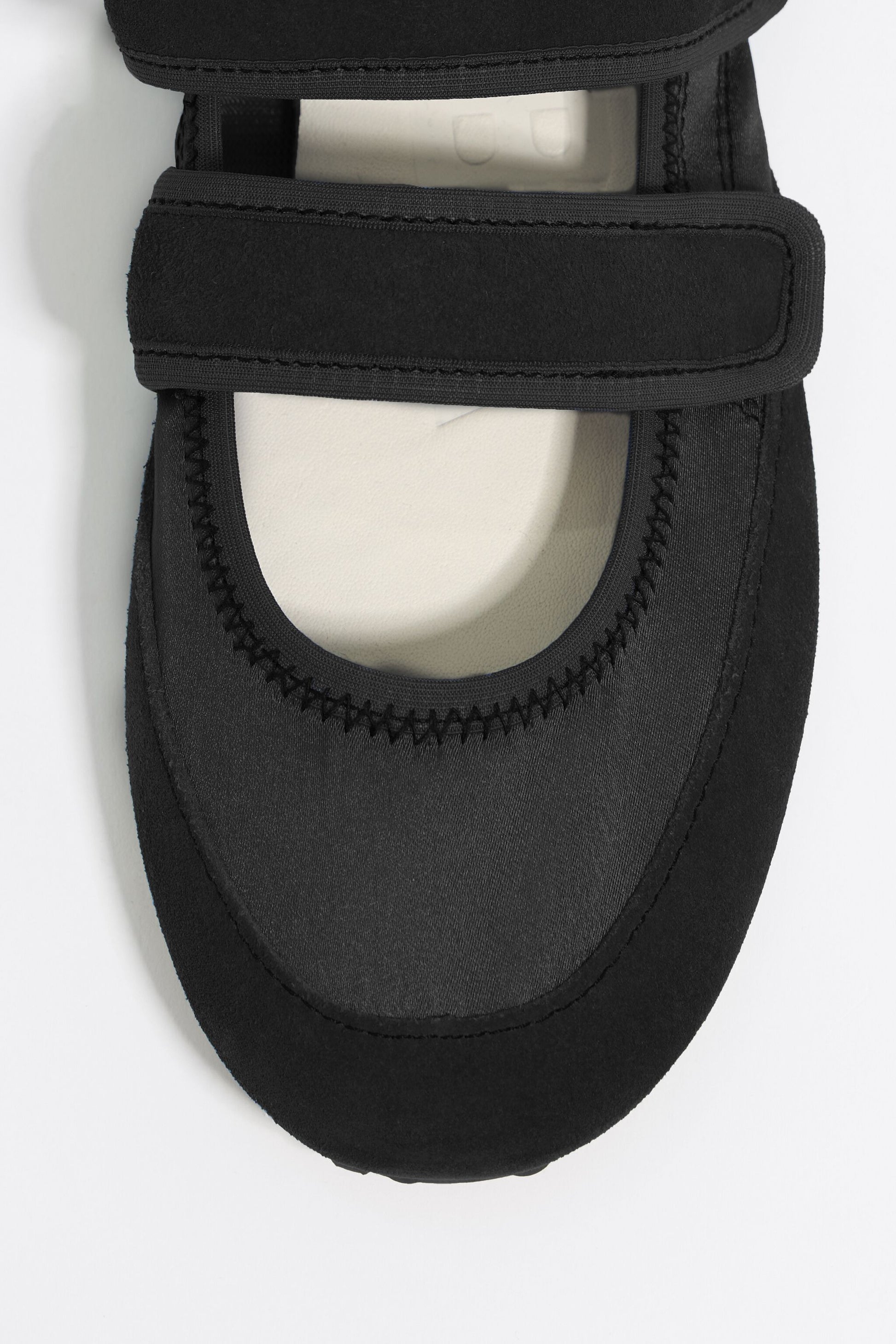 Sporty ballerina in black. Model made with pieces of split leather and black technical fabric with a double-velcro fastener. Insole with engraved logo and rubber sole.