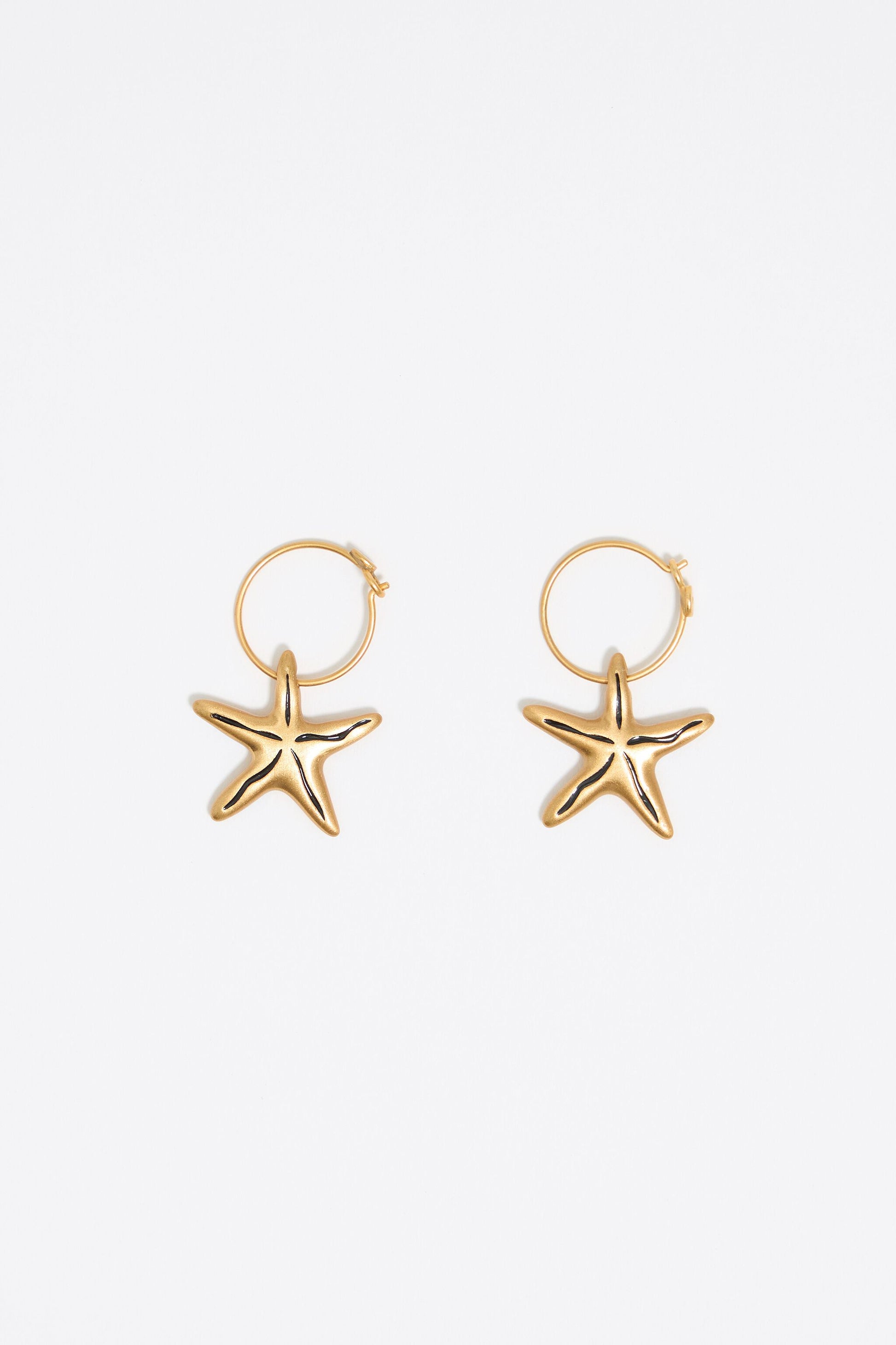 Gold-tone metal hoop earrings with stars in black. Model customized with engraved logo.