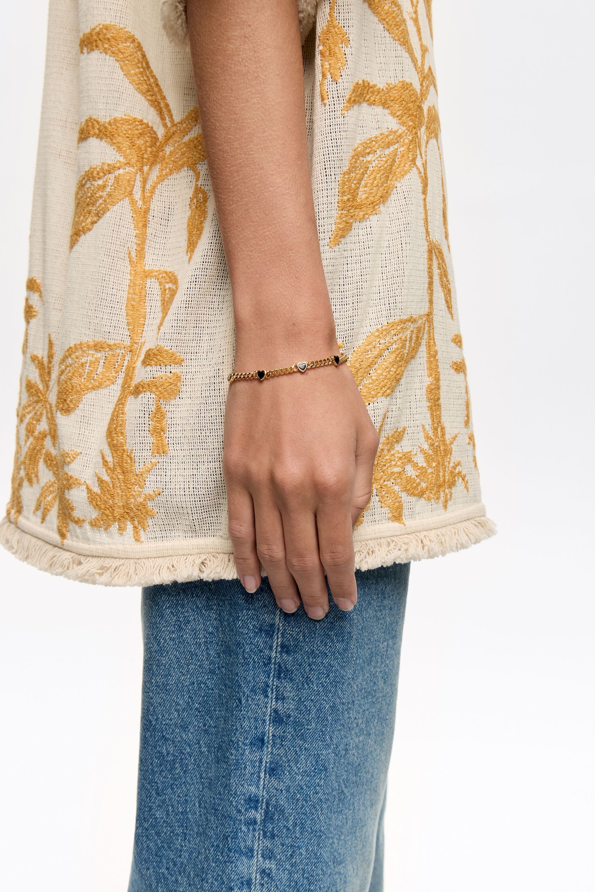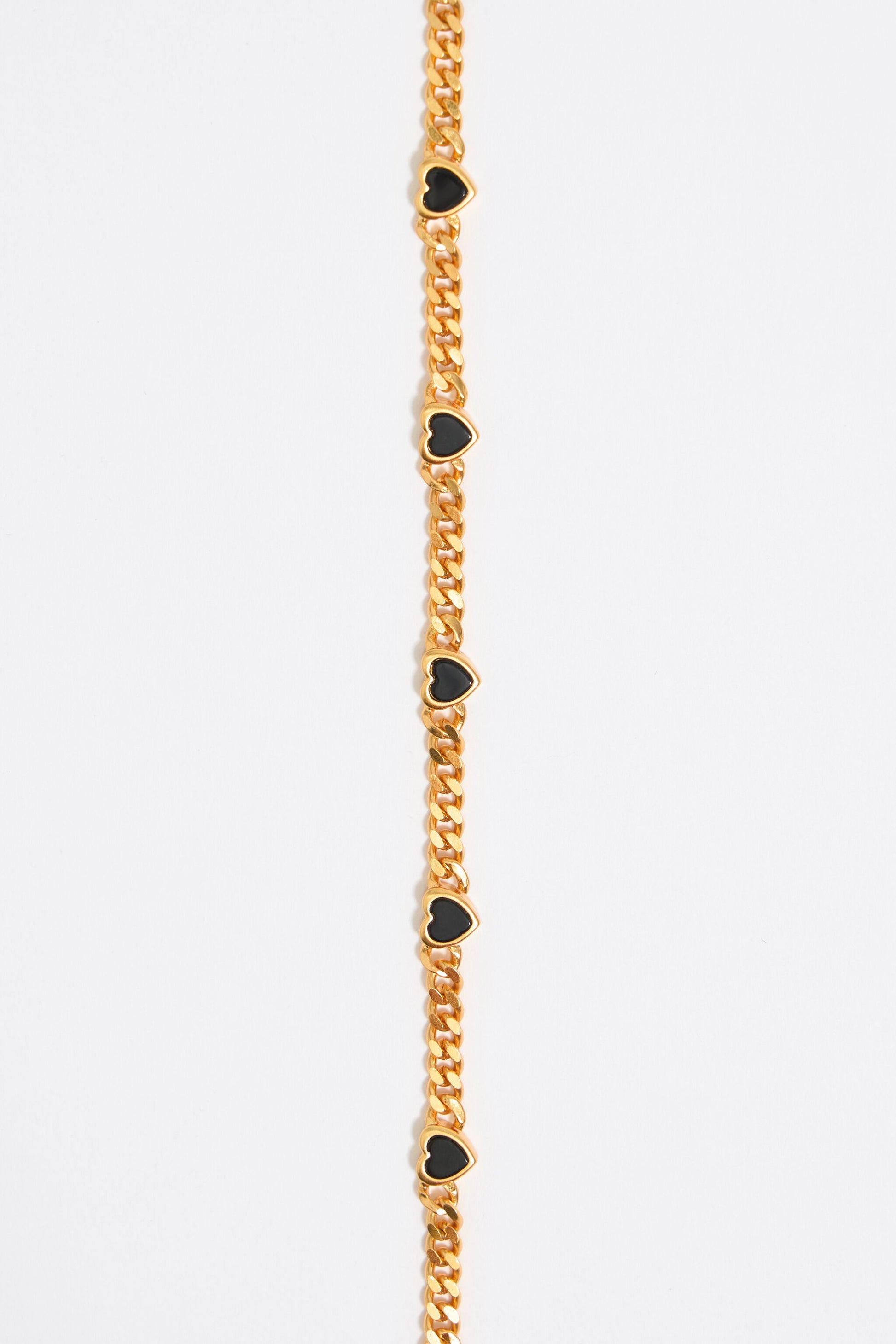 Gold tone metal chain bracelet with black heart-shaped stones. Model customized with engraved logo.