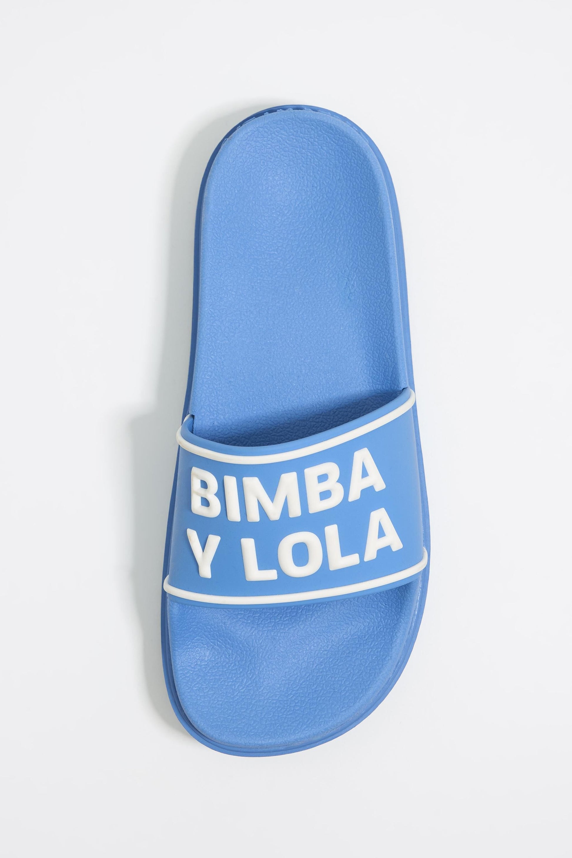Platform slider in blue with white logo. Model with logo strap. Logo sole with serrated finish.