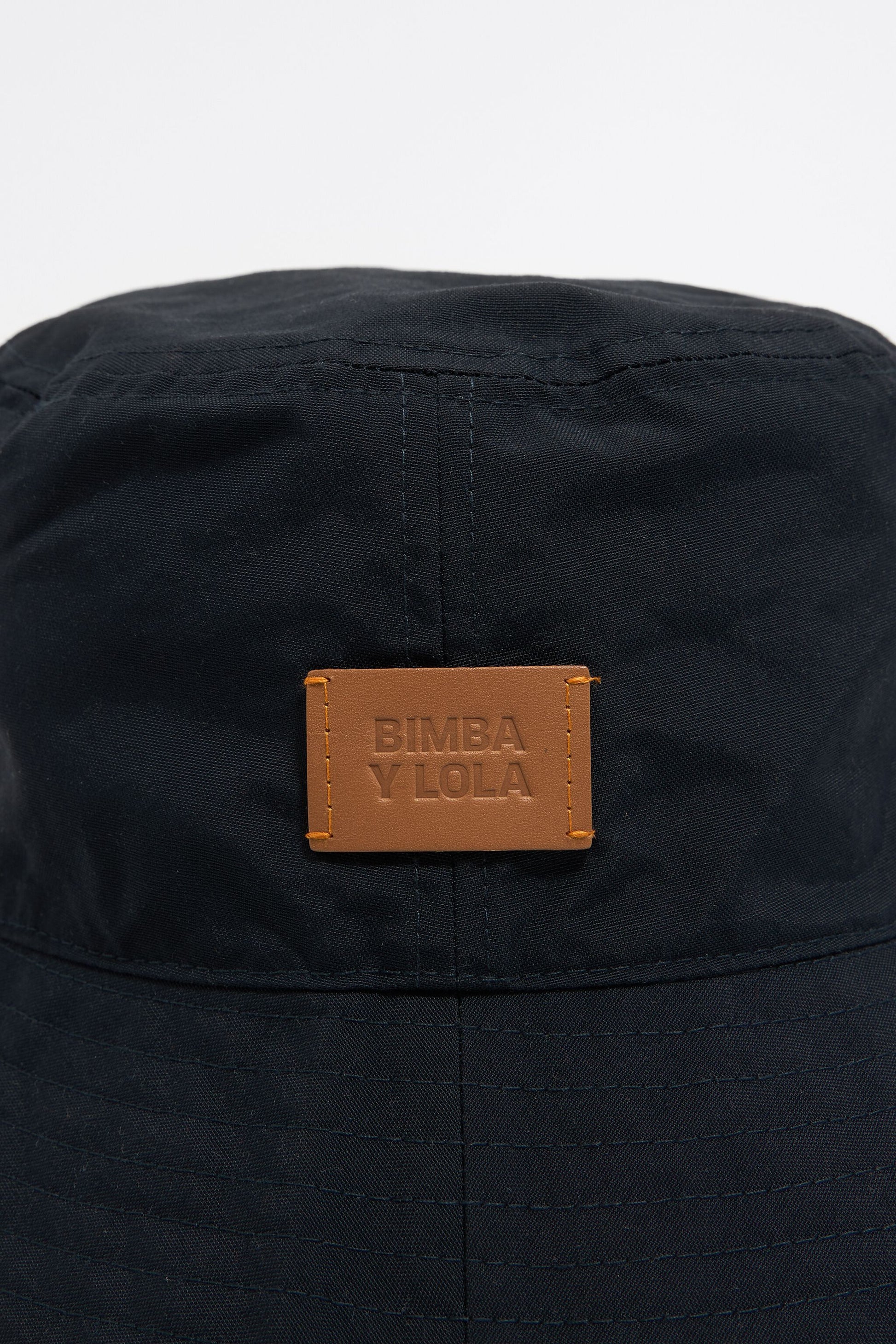 Trench fabric bucket hat in navy blue. Model customized with leather logo label.