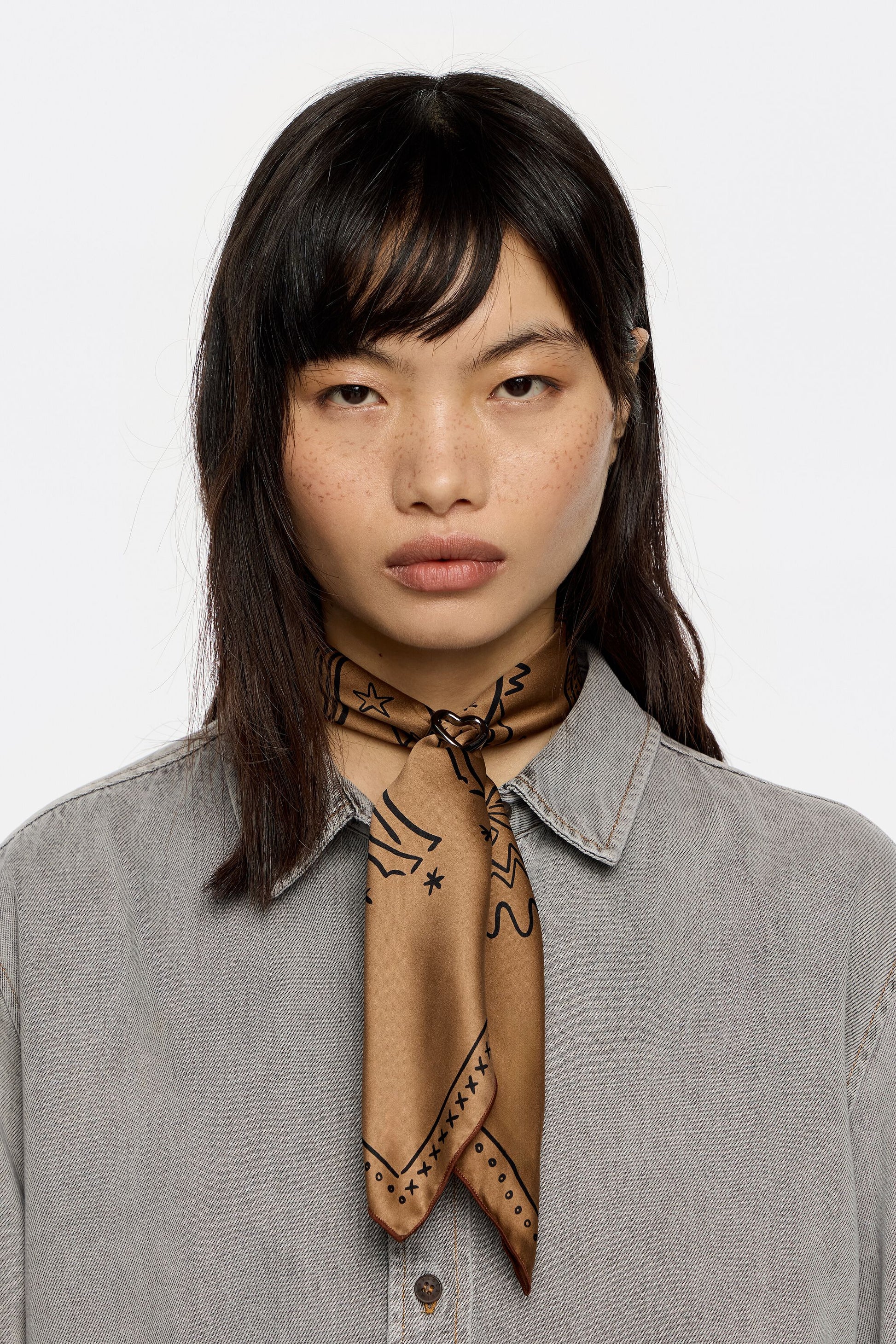 Scarf-shaped bag charm in brown with esoteric print. 100% recycled polyester.