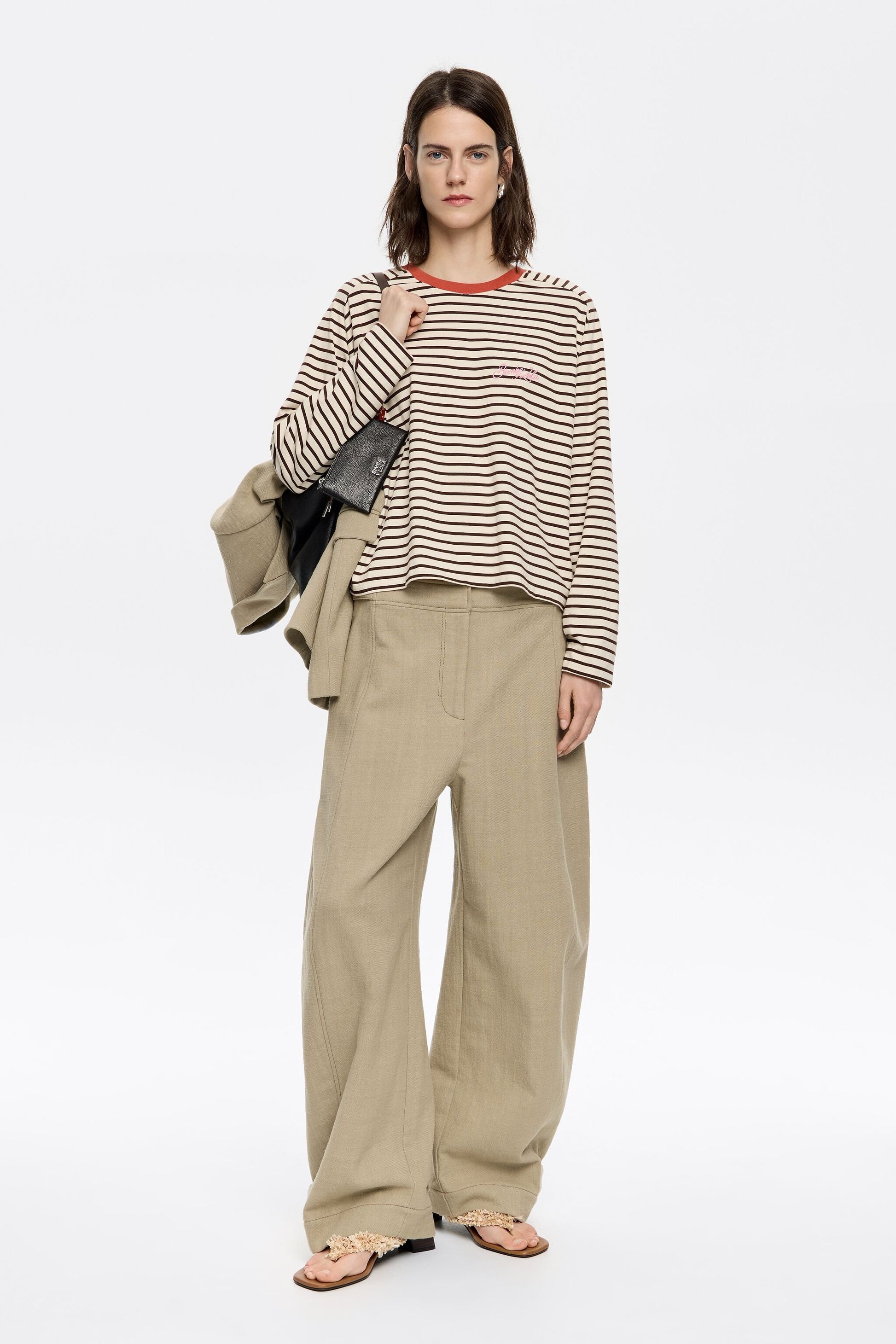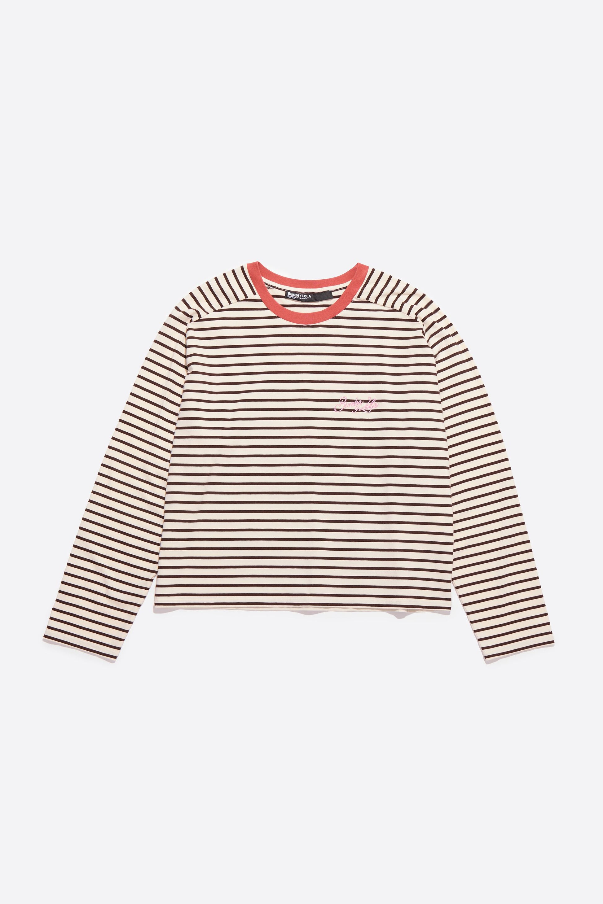 Striped print cotton T-shirt in brown. Straight cut, crew neck with contrast piping, and long straight sleeve. Exterior customized with embroidered logo.