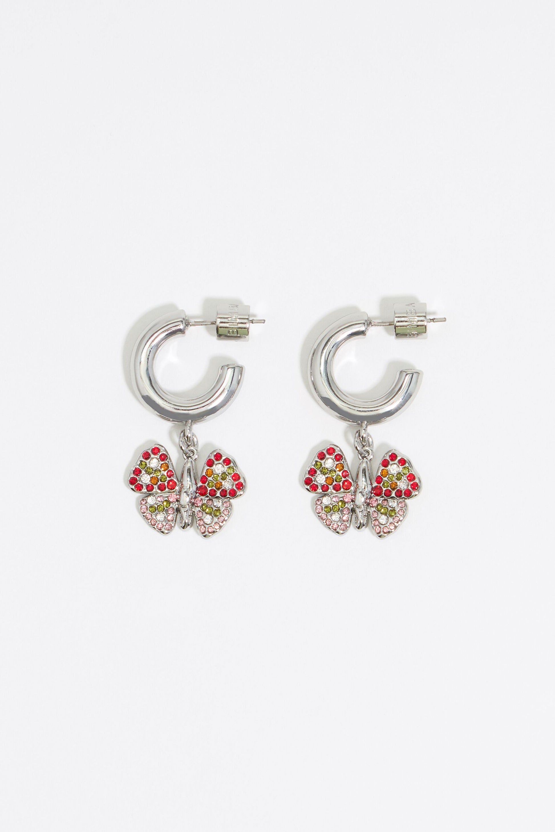 Silver metal hoop earrings with butterfly. Model customized with engraved logo.