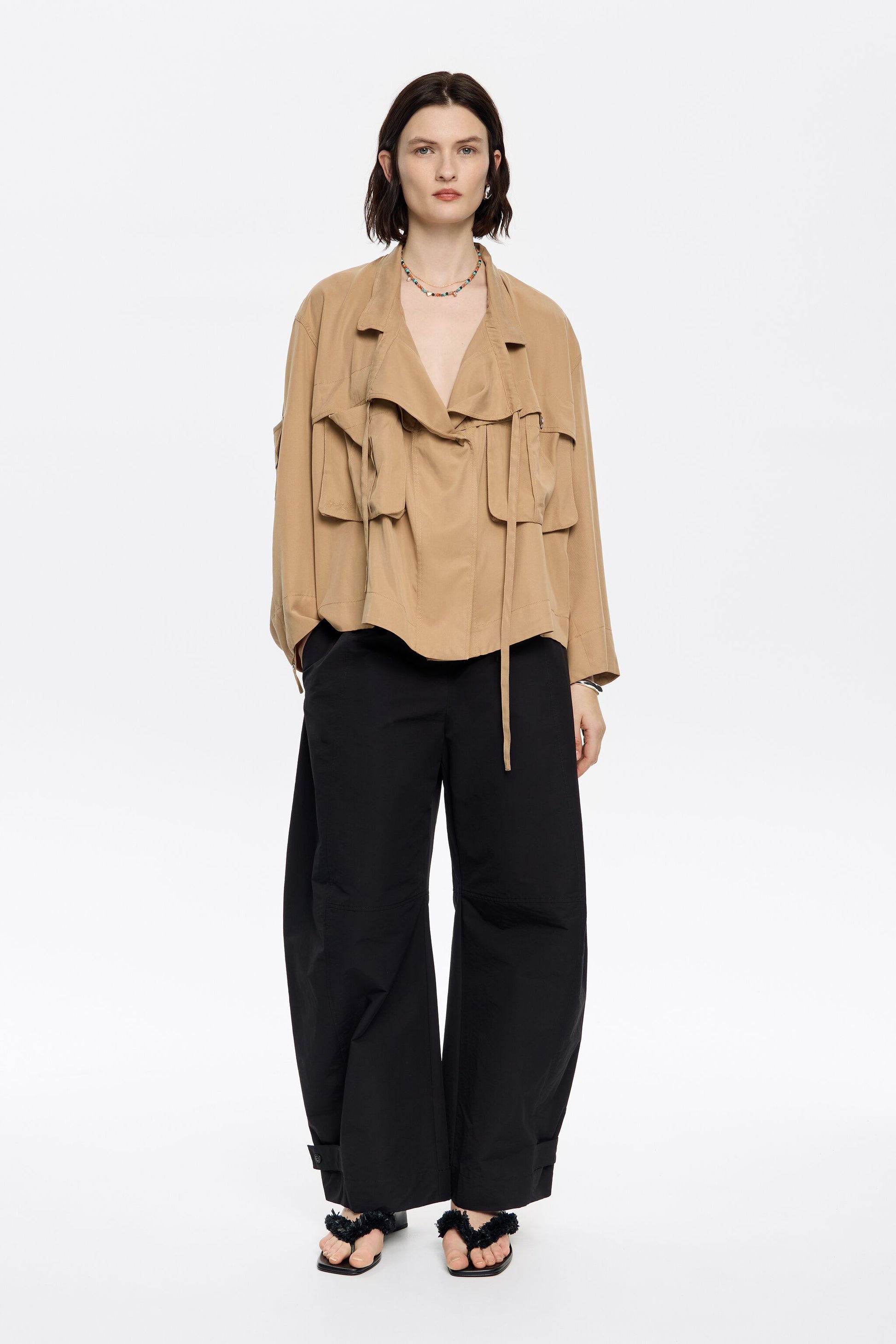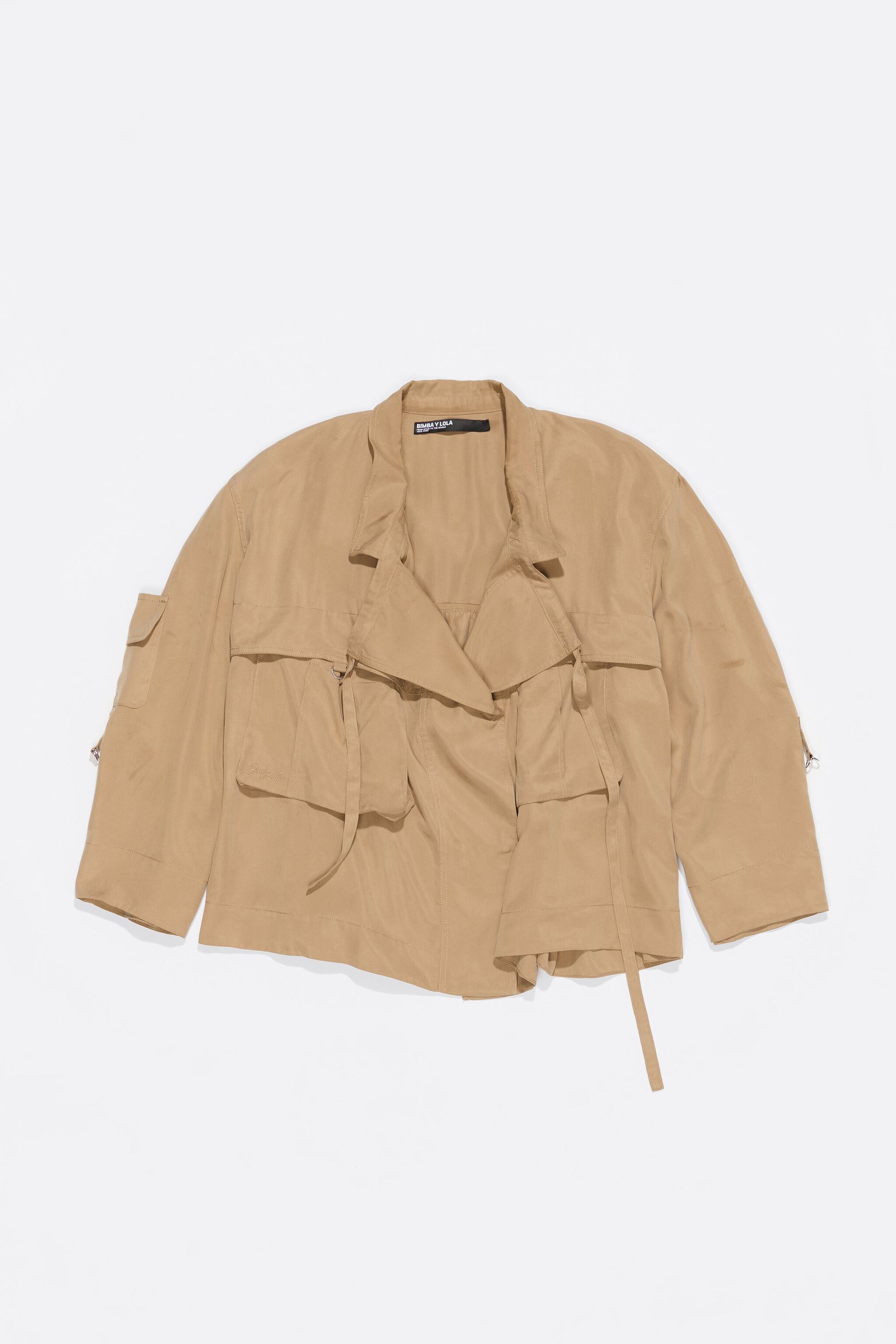 Short double-breasted jacket in camel. Fluid cut with high neck, long sleeve with tab and button-up front. Double-breasted front with adjustable neckline with fabric straps, and adjustable waist. Exterior customized with embroidered logo.