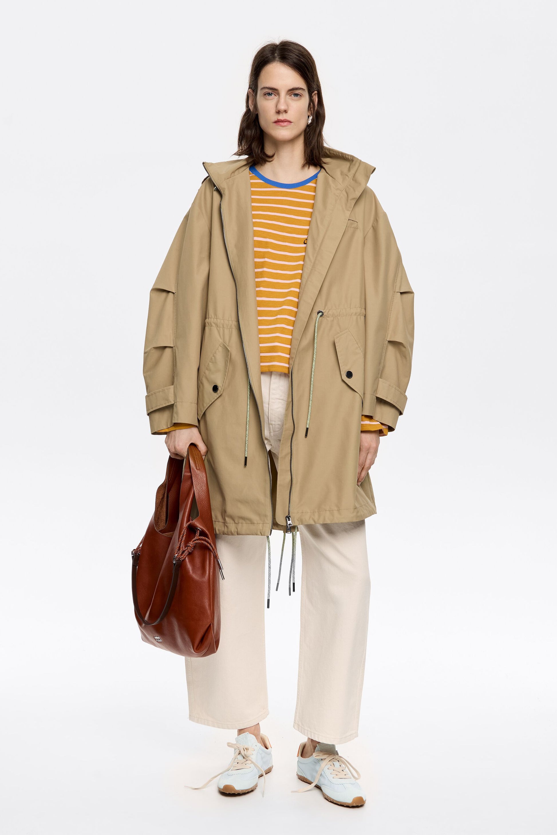 Striped print cotton T-shirt in caramel. Straight cut, crew neck with contrast piping, and long straight sleeve. Exterior customized with embroidered logo.