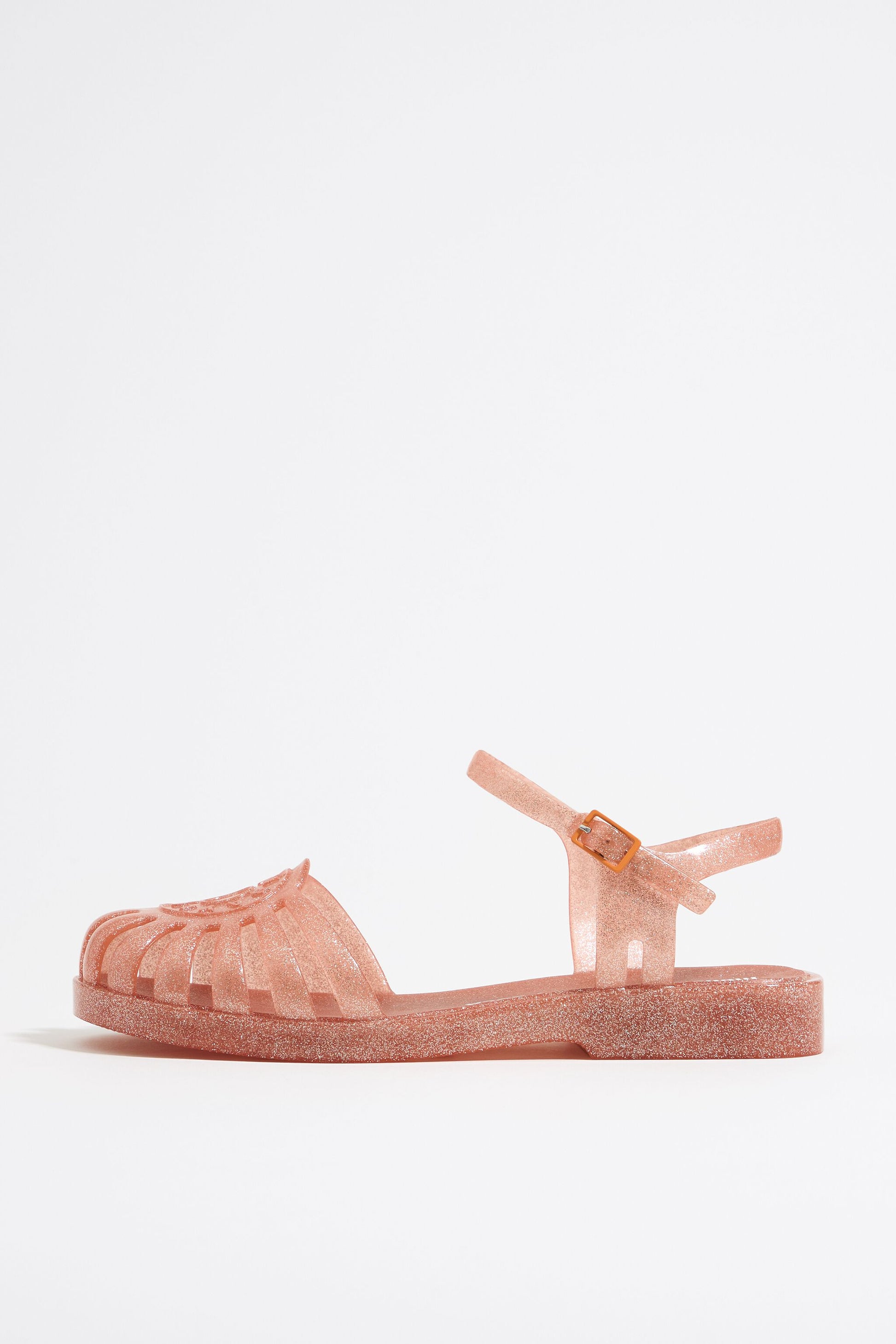 Jelly sandal in coral with glitter in collaboration with the Brazilian brand MELISSA, which is renowned for its innovative Melflex® material, characterized by being recyclable, vegan and highly flexible. Model with buckle fastener. Exterior and sole customized with the MELISSA / BIMBA Y LOLA logo.