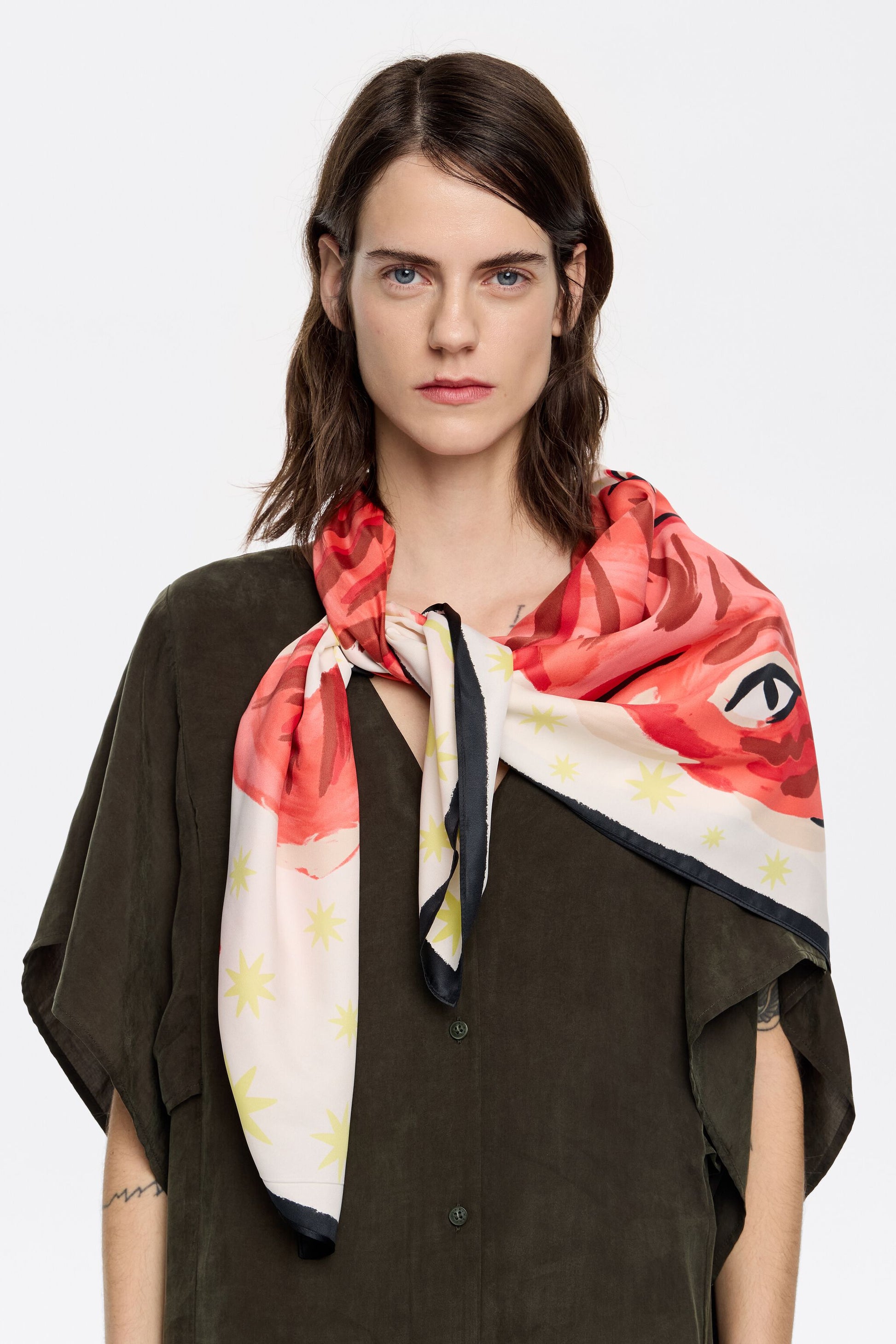 Scarf with tiger sketch print on a coral background. 100% Recycled polyester.
