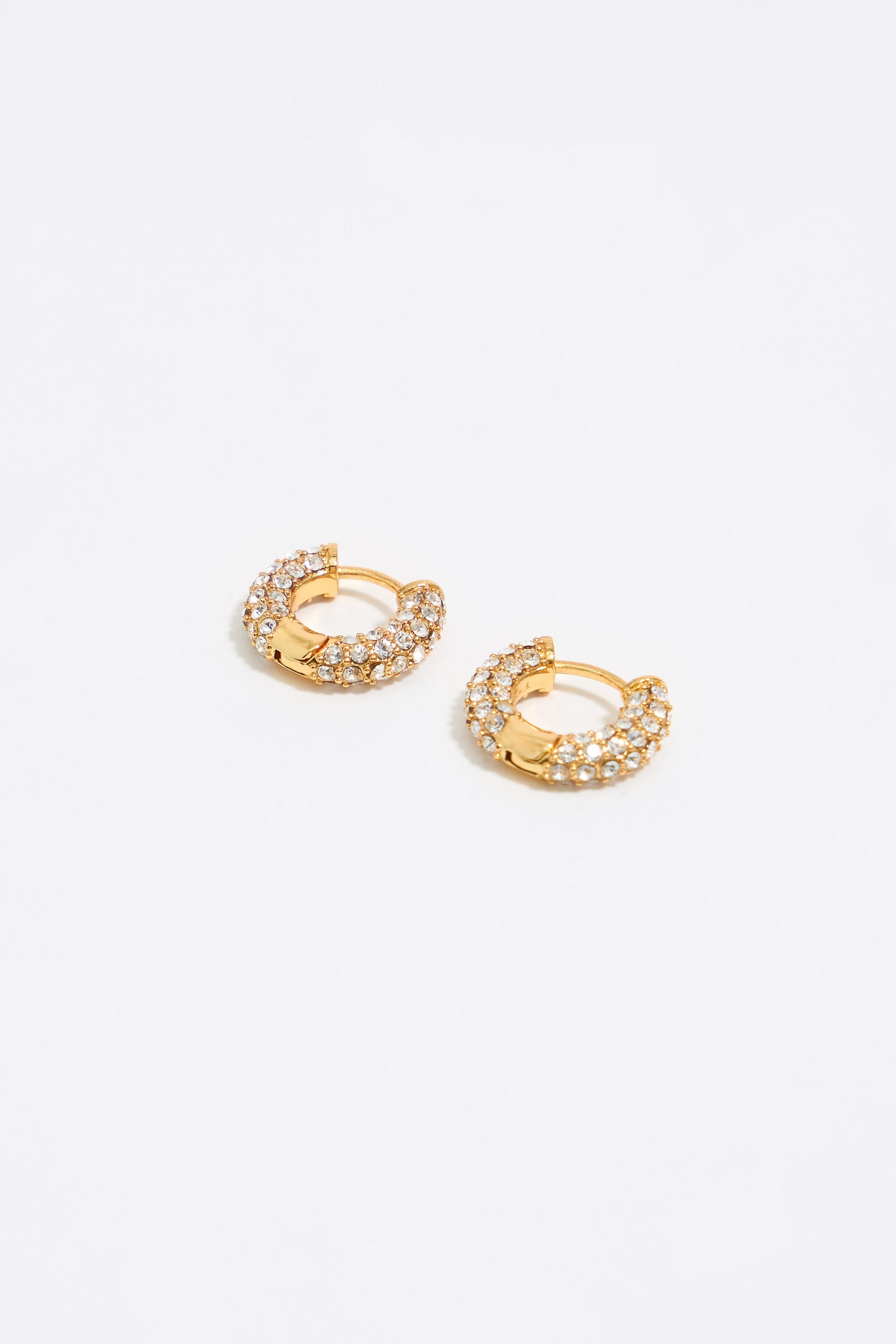 Gold hoop earrings with crystals. Model customized with engraved logo.