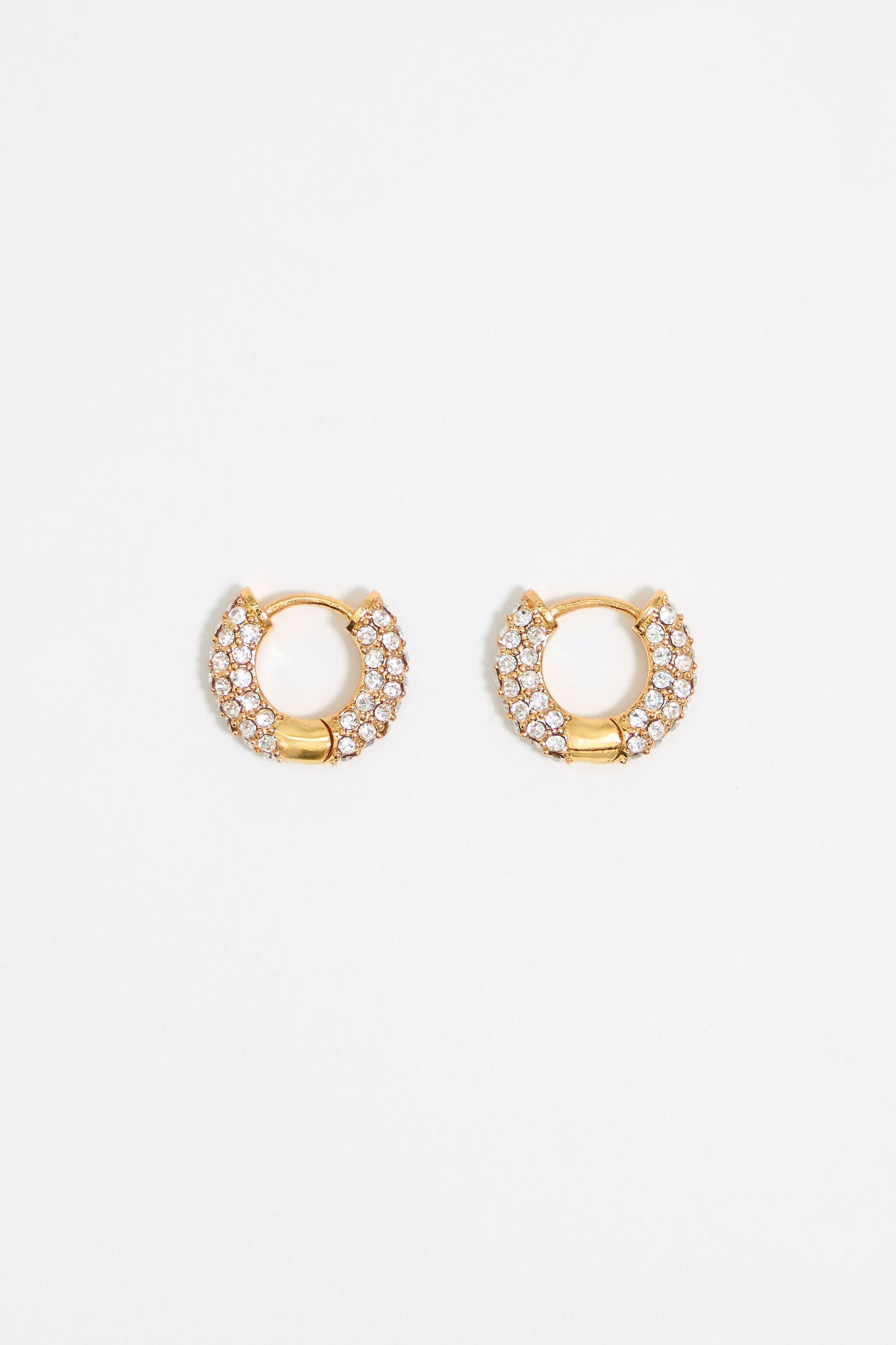 Gold hoop earrings with crystals. Model customized with engraved logo.