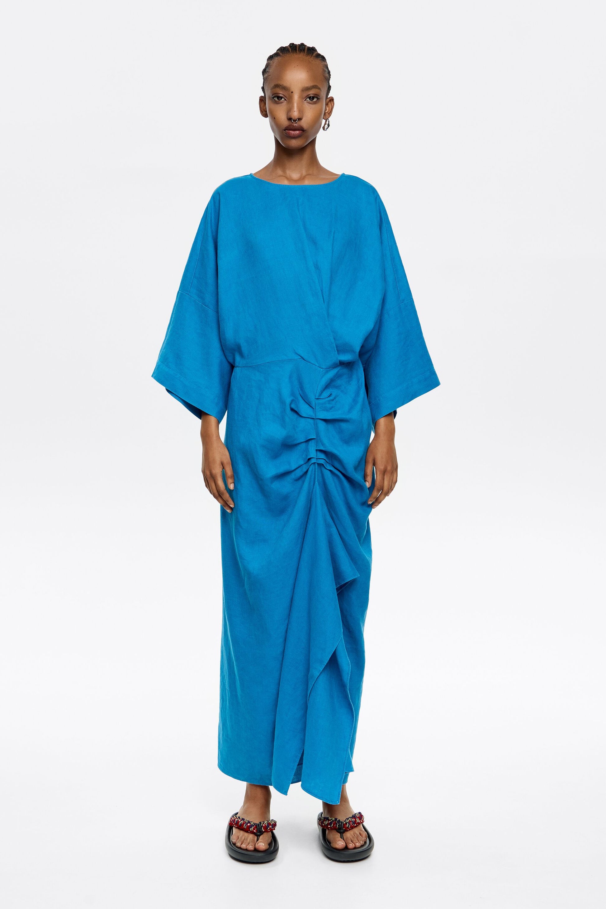 Electric blue linen dress with ruffle