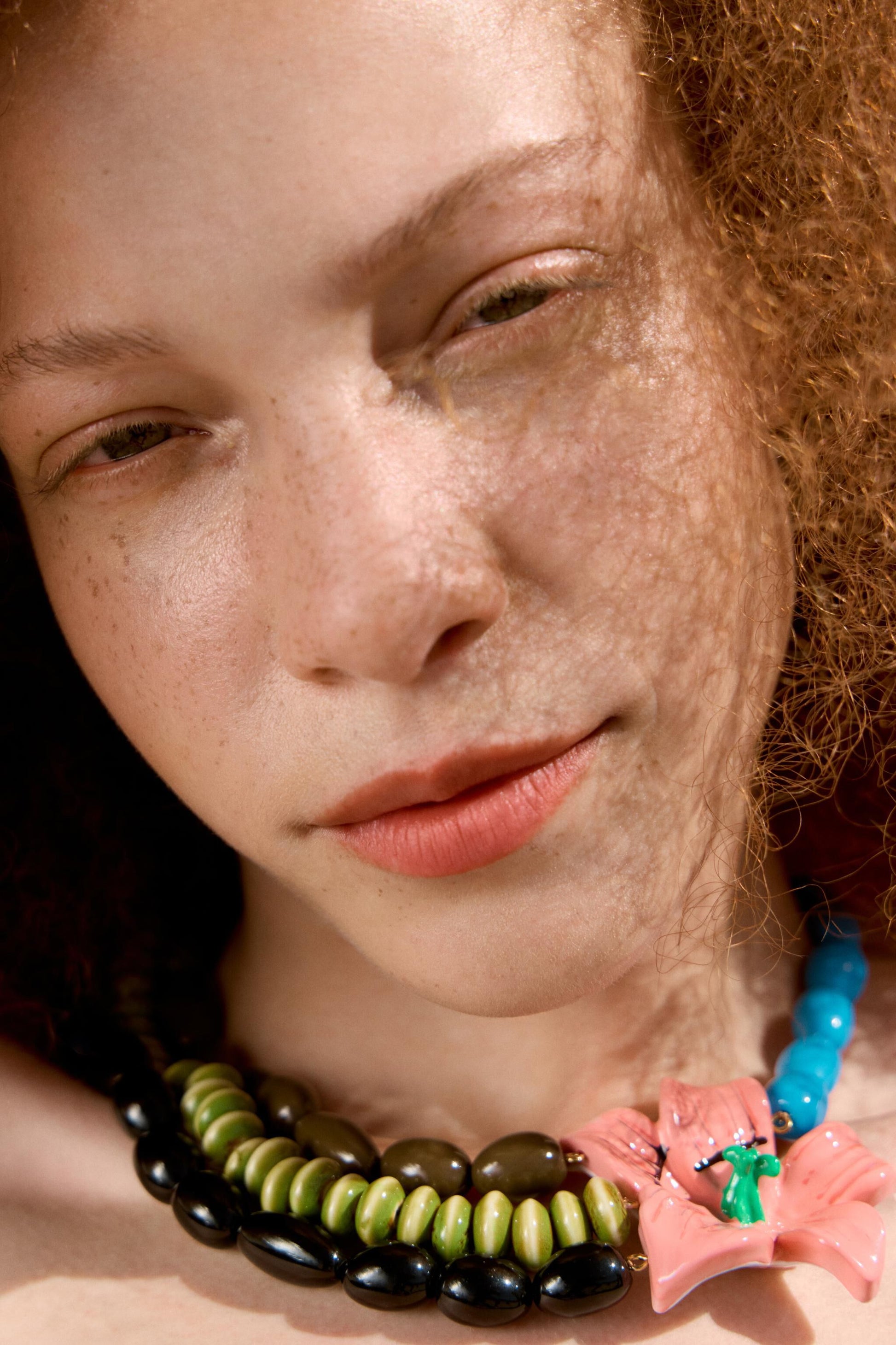 Necklace with ceramic beads and flower. Model customized with engraved logo.