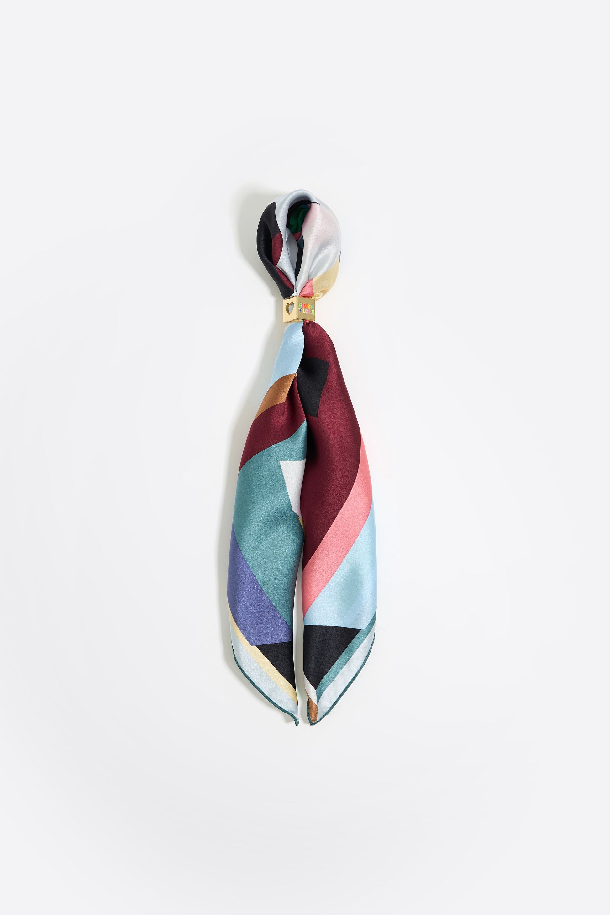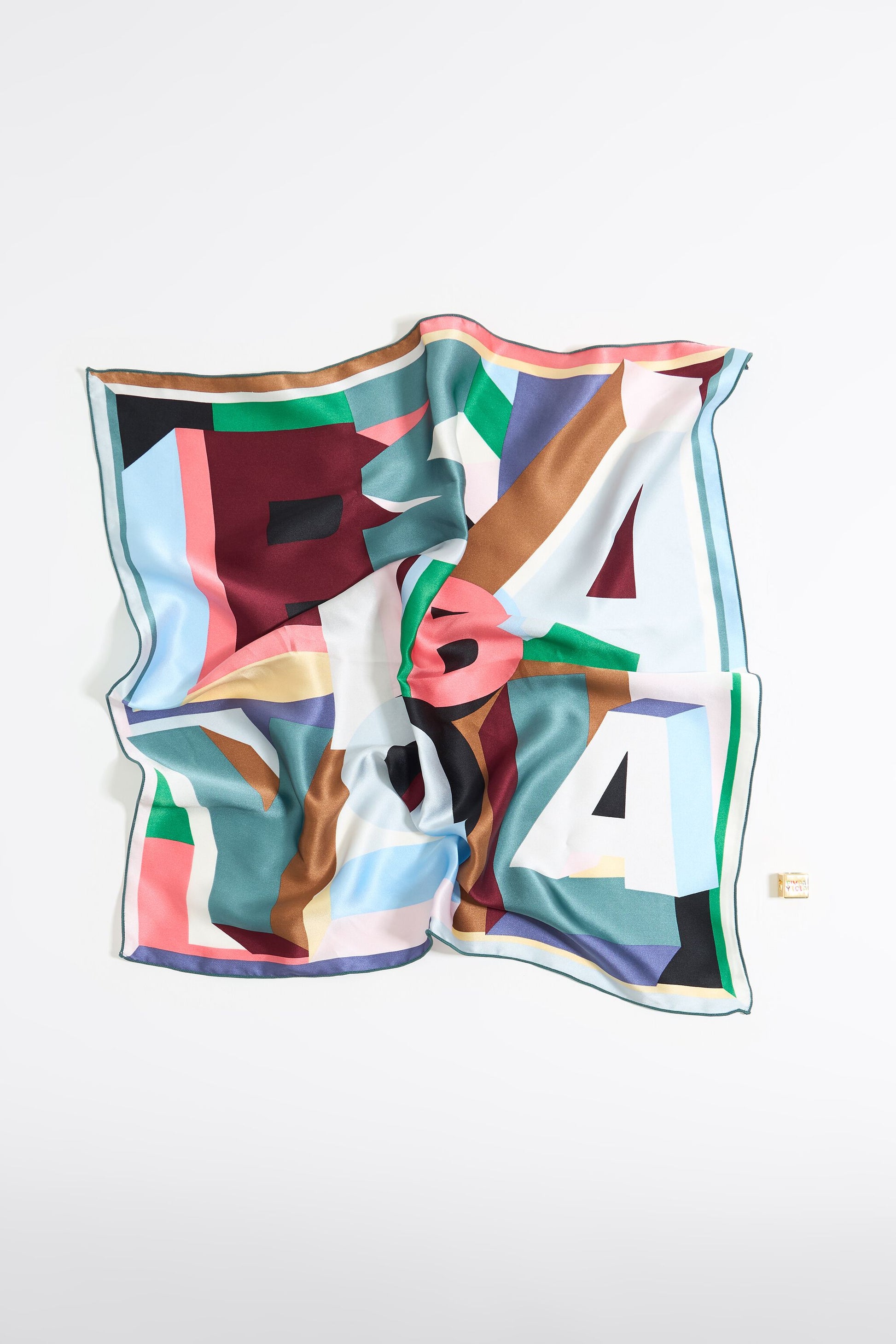 Charm scarf with geometric logo and metal dice. Model customized with engraved logo and enamel on the dice.
