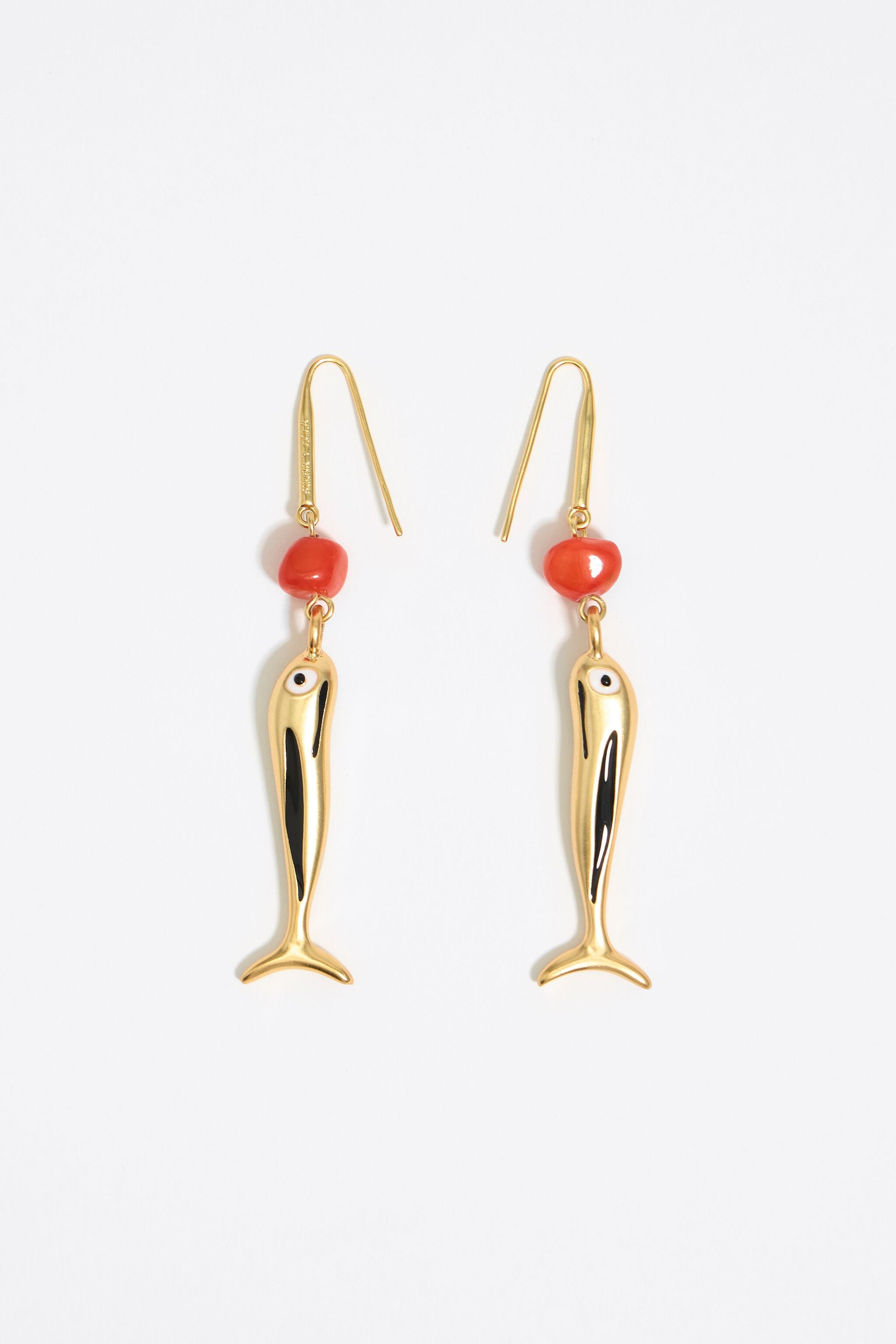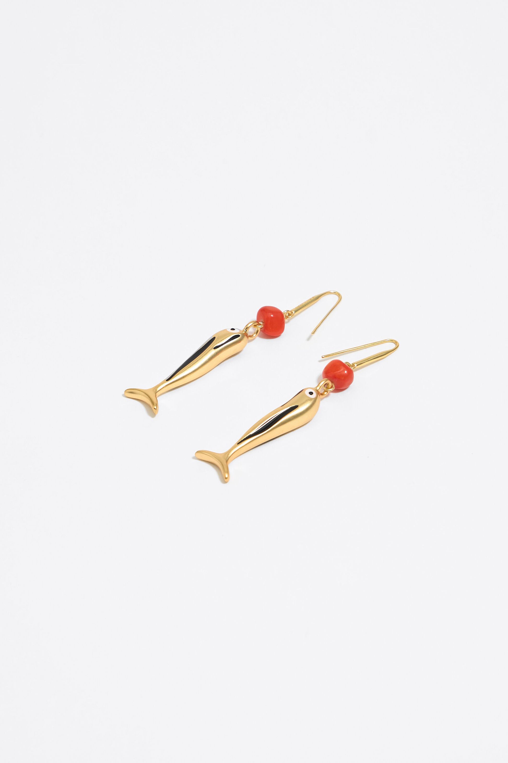 Aged finish gold-tone metal earrings in the shape of a fish. Model customized with engraved logo.