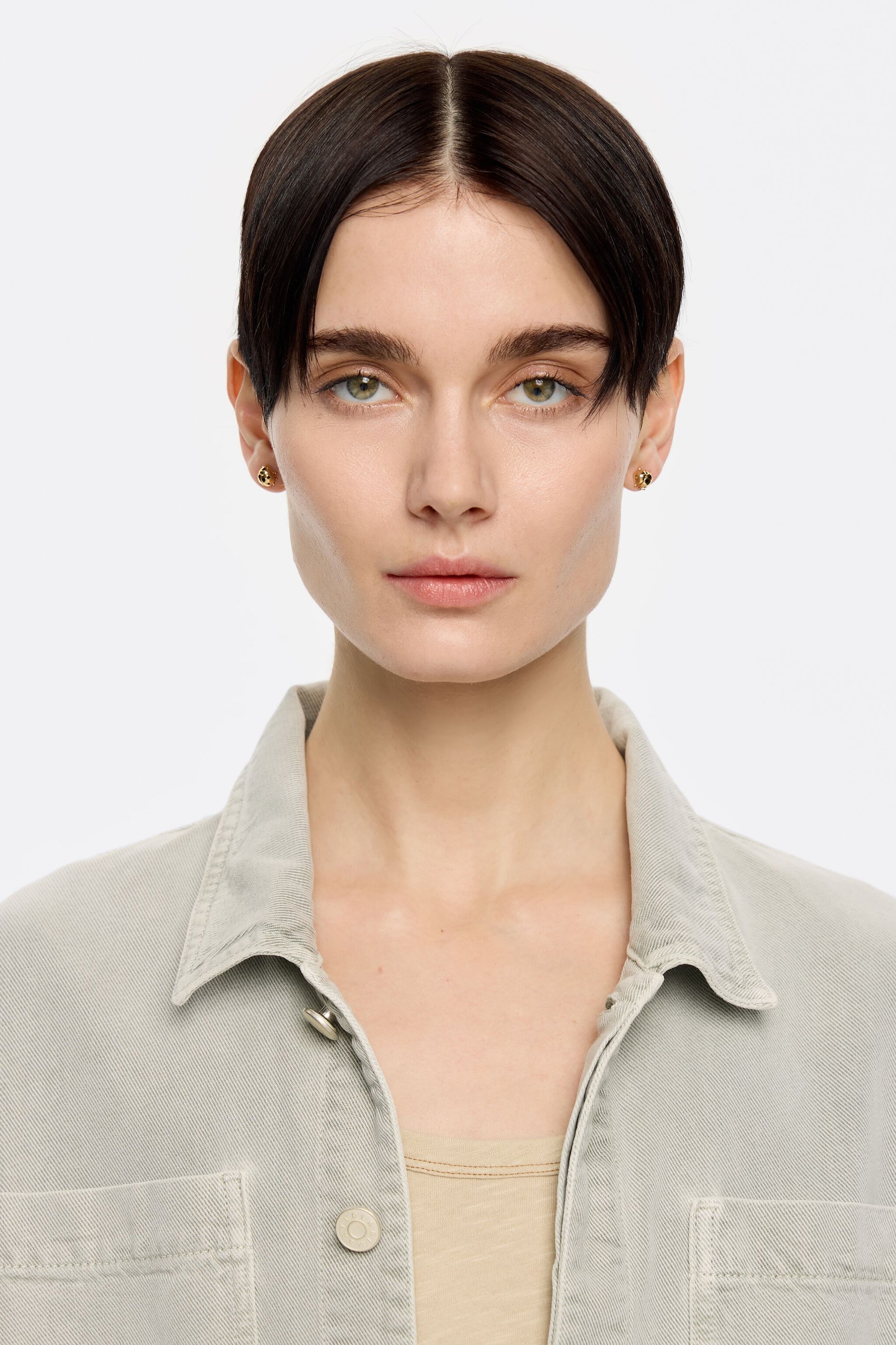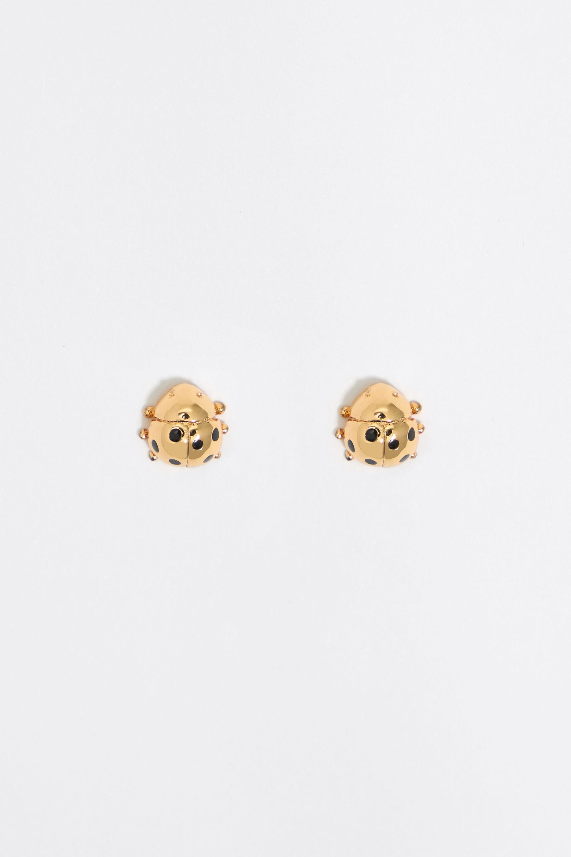 Gold tone metal ladybug earrings. Model customized with engraved logo.