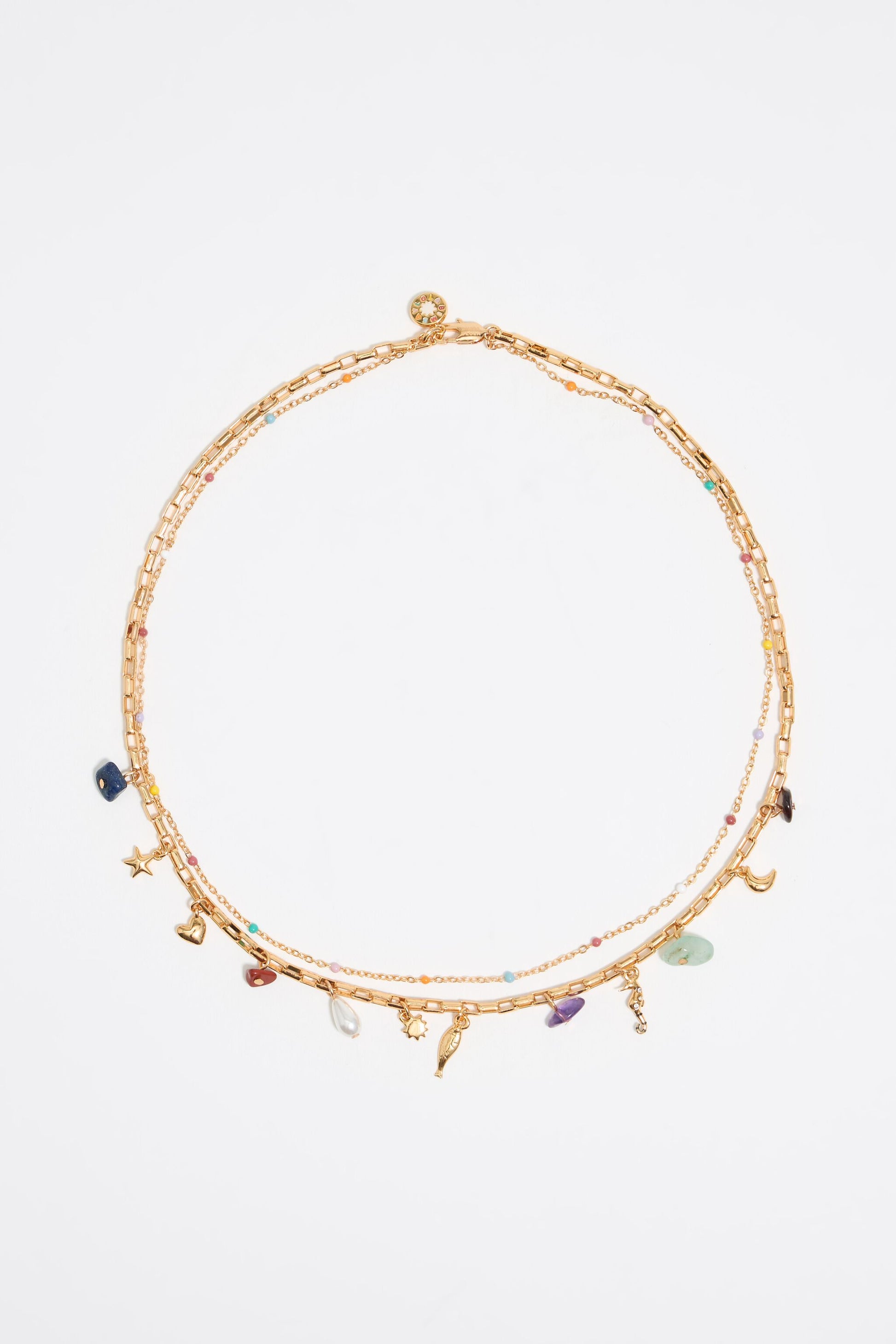 Layered necklace with gold-tone metal chains with stones and fish pendant. Model customized with engraved logo.
