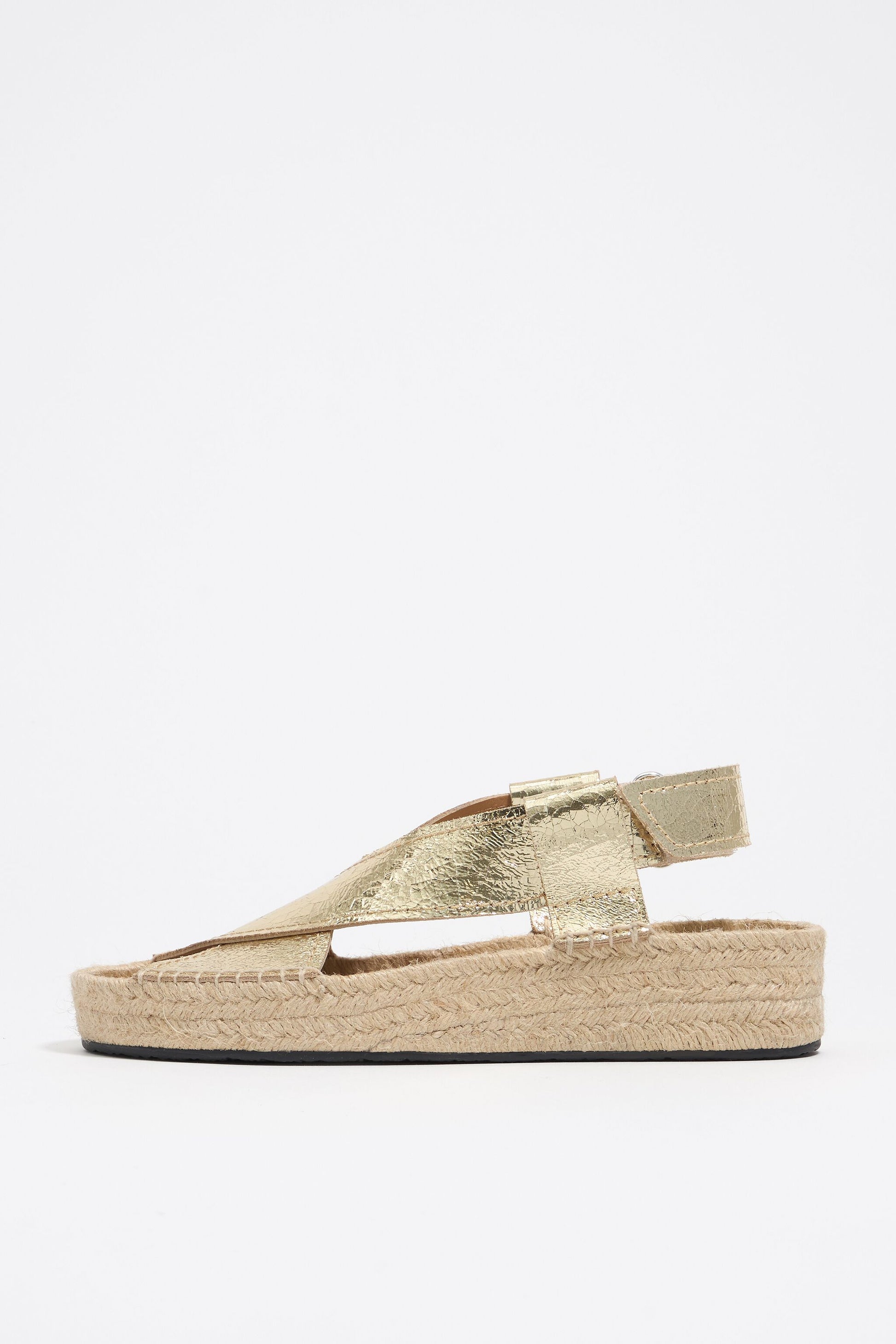 Leather wedge sandal in gold. Crossed strap model with back velcro fastener. Label with embroidered logo on the insole and customized jute platform sole.
