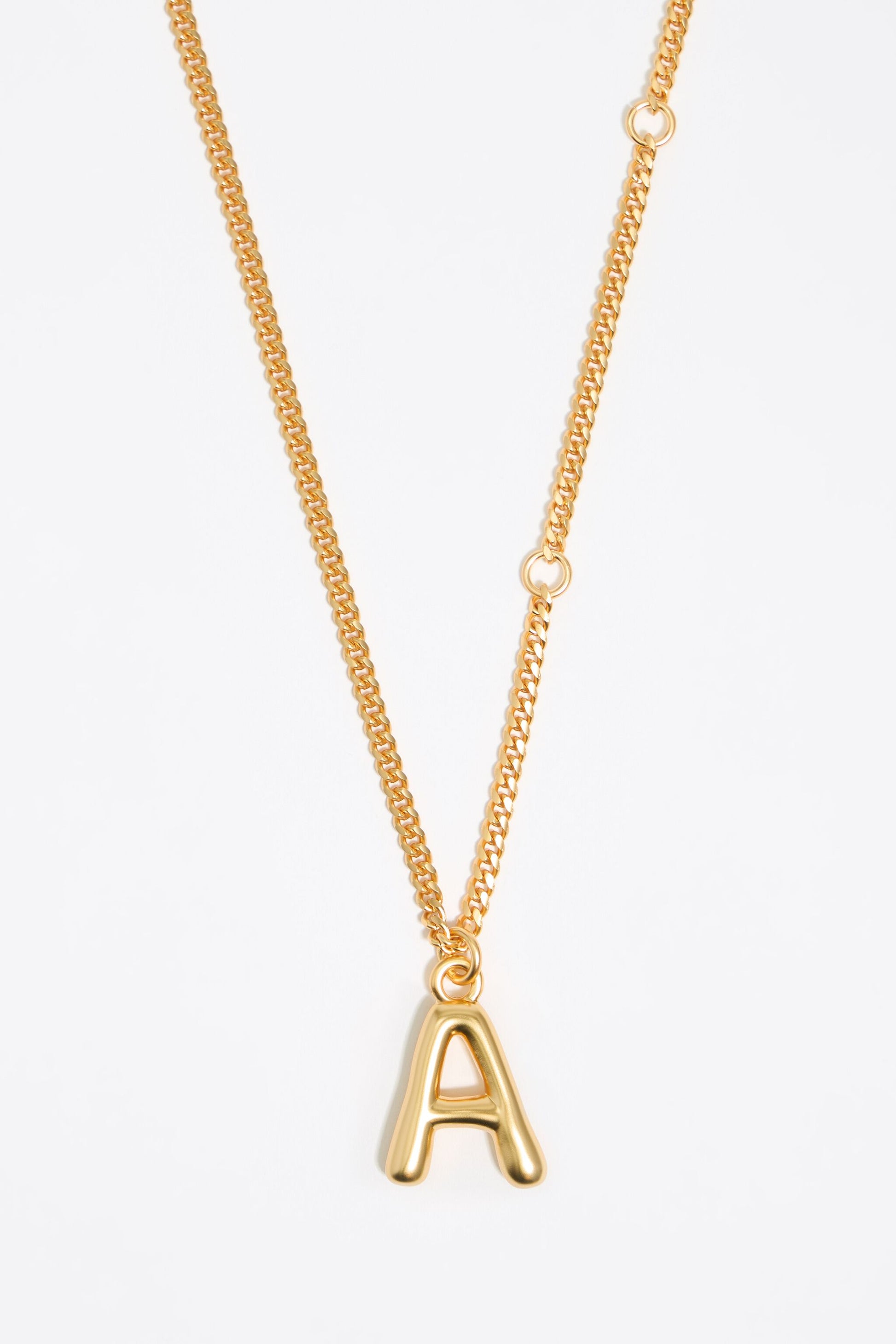 Adjustable gold tone chain necklace with letter A pendant. Model customized with engraved logo.