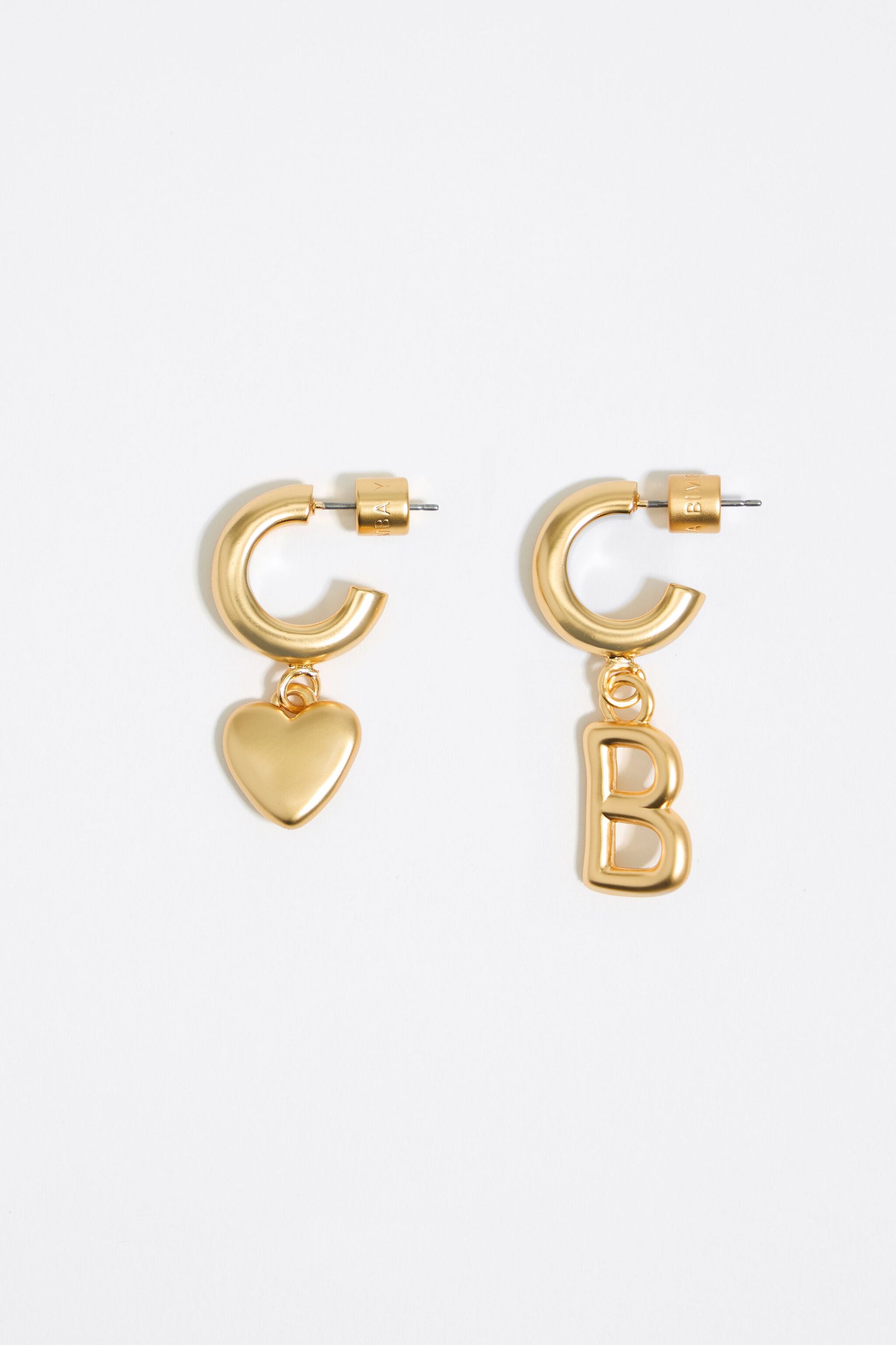 Gold tone metal hoop earrings with heart and letter B pendant. Model customized with engraved logo.