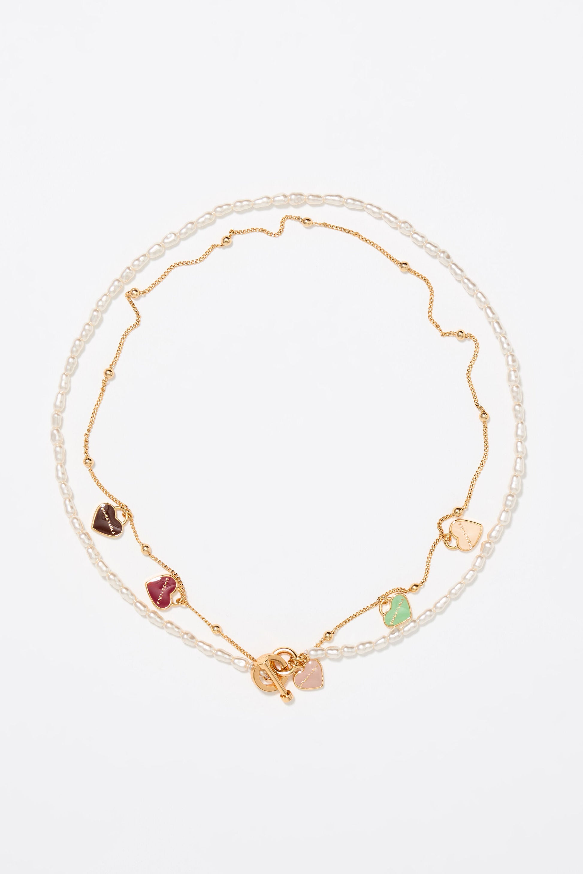 Gold-tone double-layer chain and pearl necklace with heart-shaped logo.