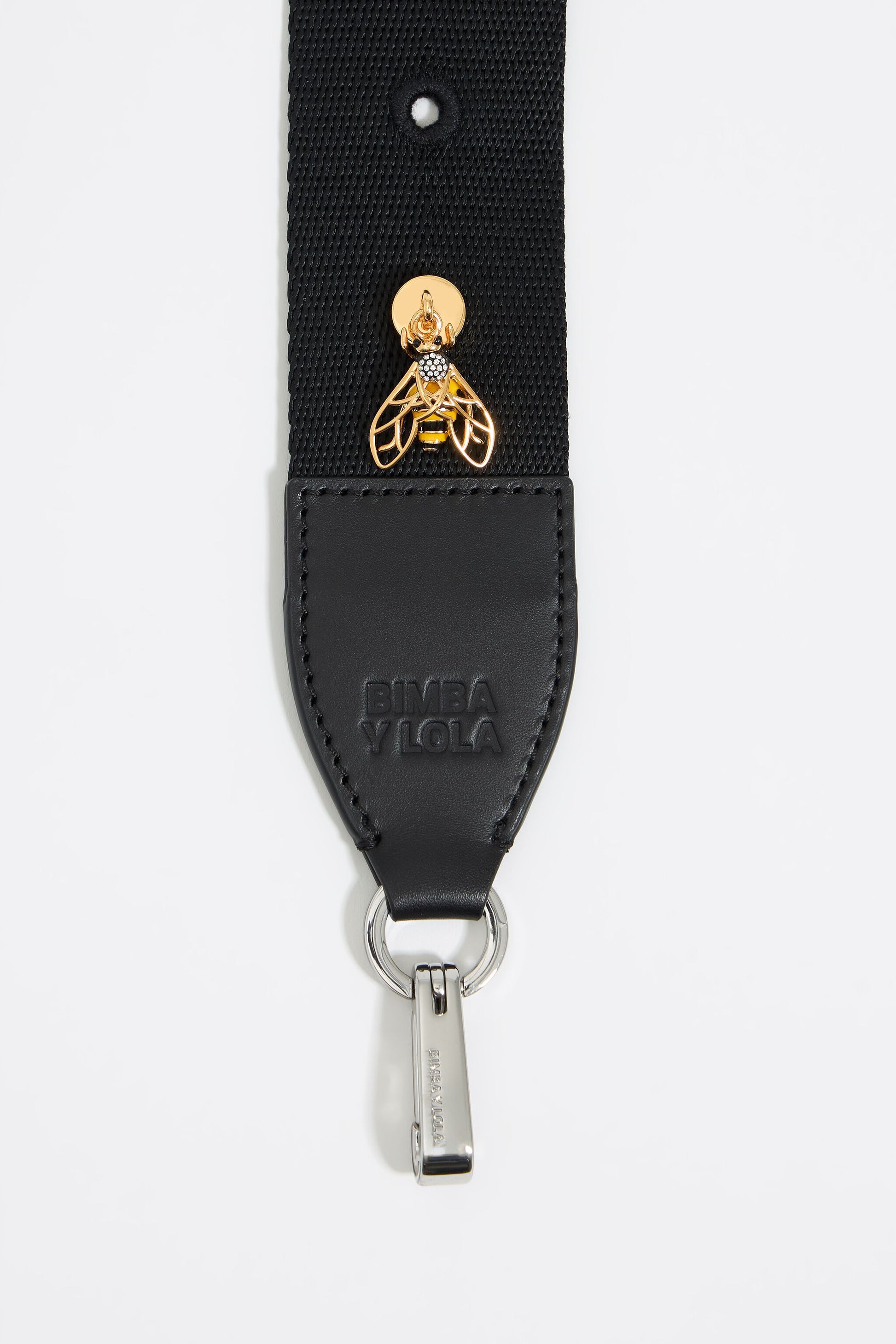 Gold metal bag charm in the shape of a bee. Model customized with engraved logo.